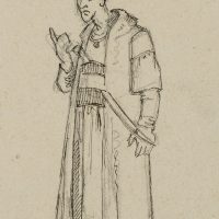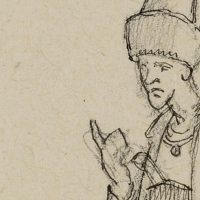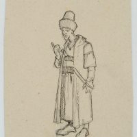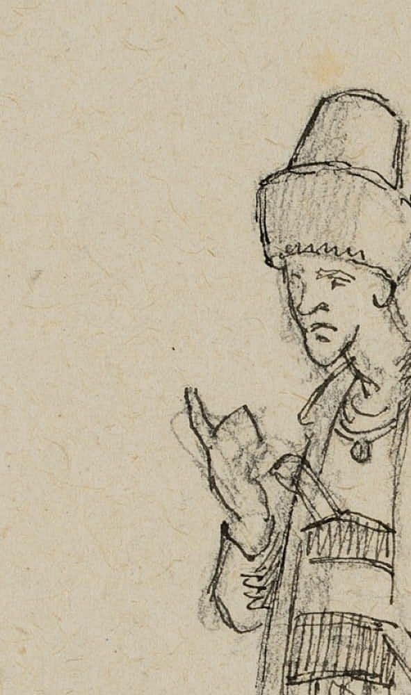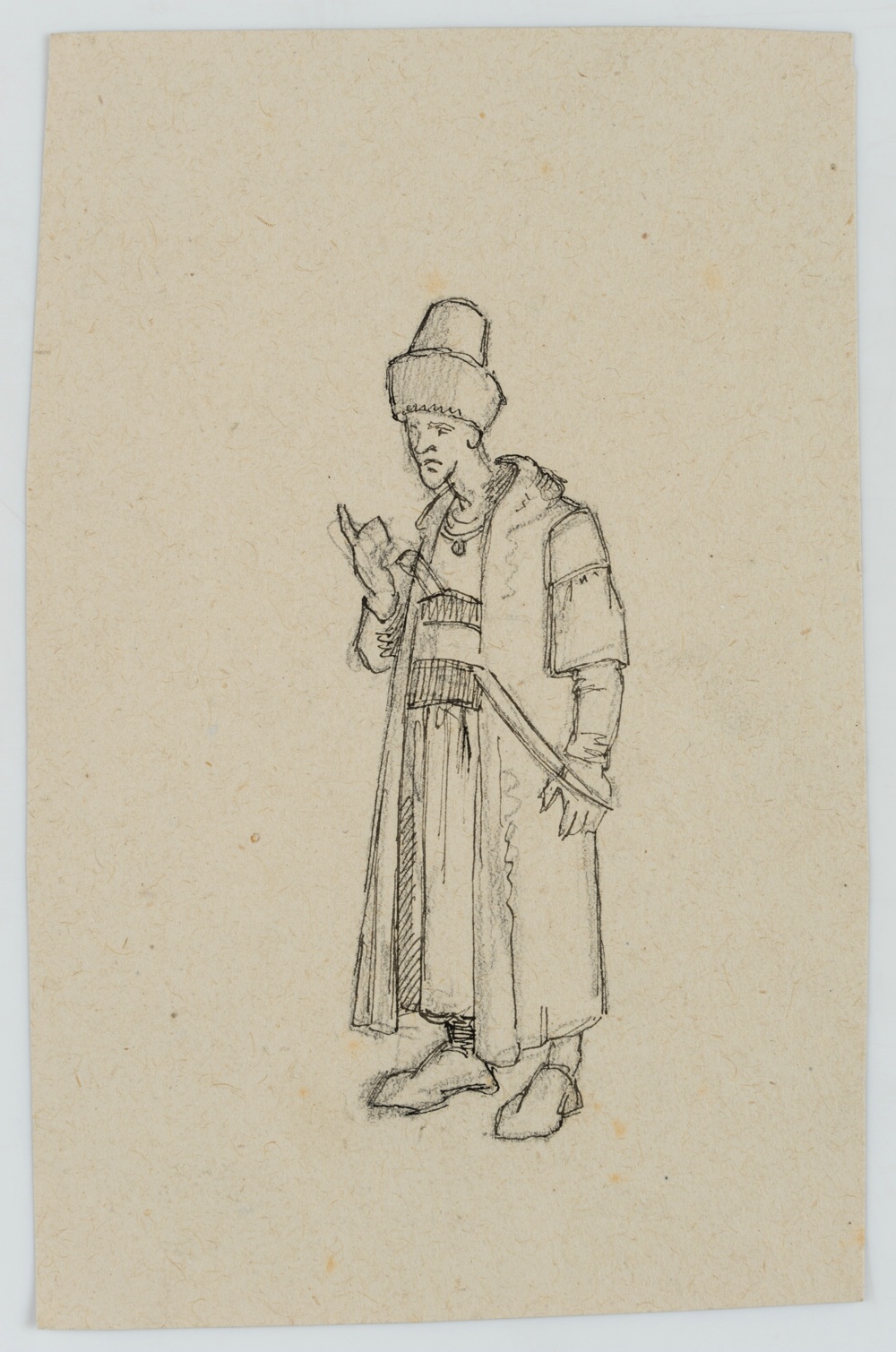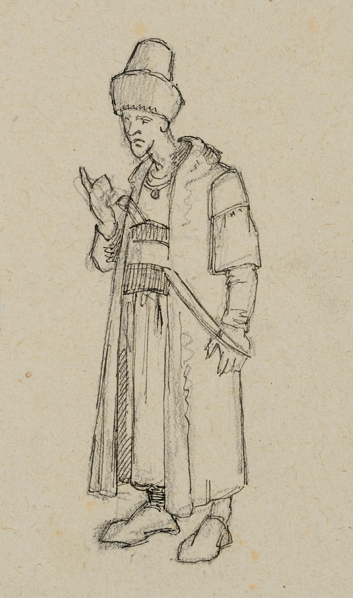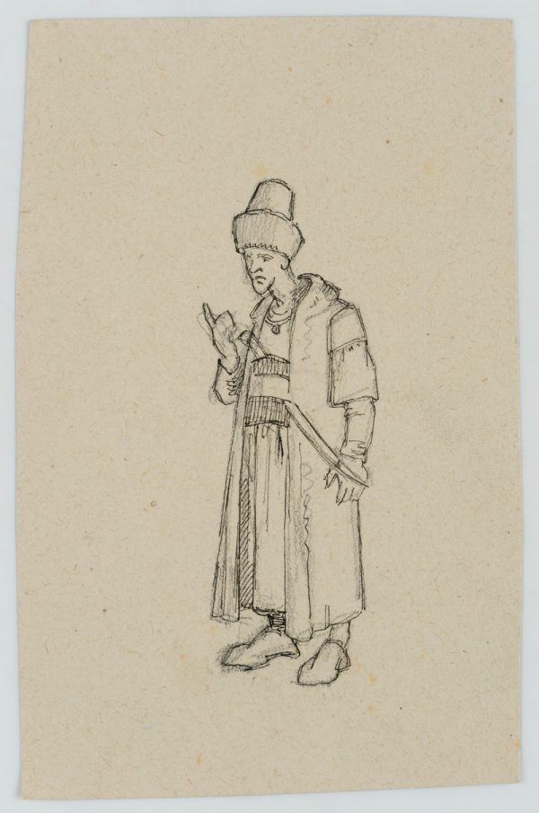 - Description: This study sheet from the sketchbook of the Danish artist Rondahl shows a full-figure depiction of an oriental warrior wearing a fur cap and cloak. A sabre is stuck in his sash. Other figures are sketched on the reverse. The drawing comes from a collection of history and saga depictions with Nordic scenes and themes by the hand of the Danish artist Rondahl, who made a name for himself especially as a draughtsman. He provided the designs for numerous historical, archaeological and literary writings.