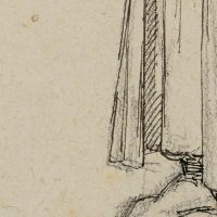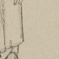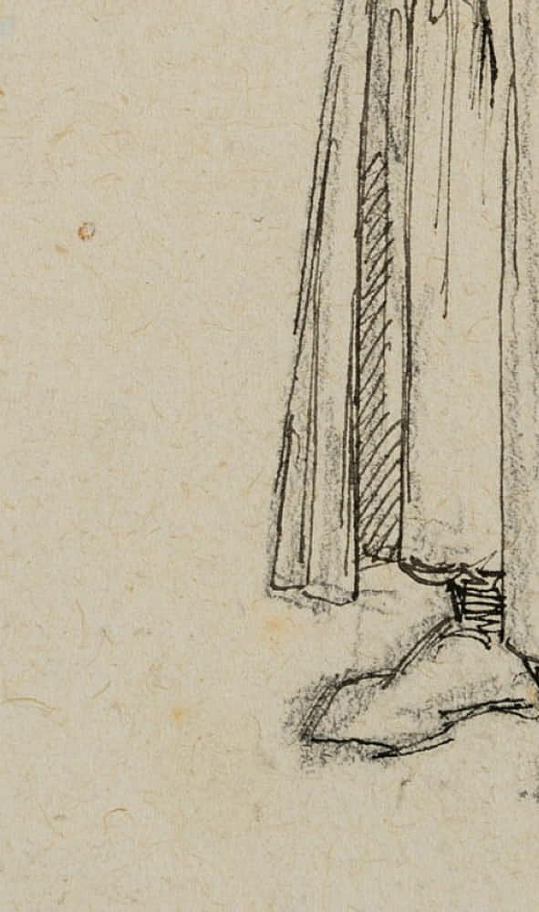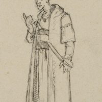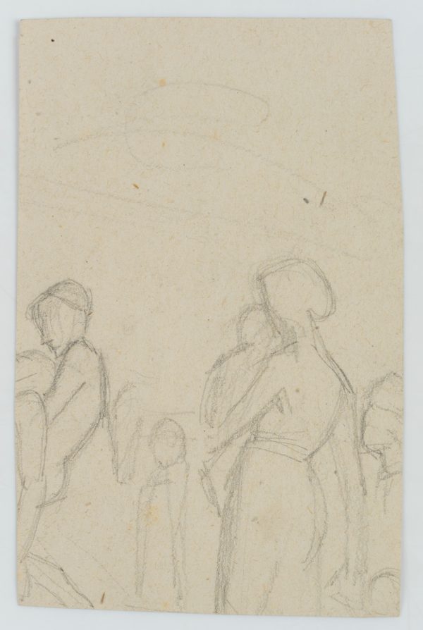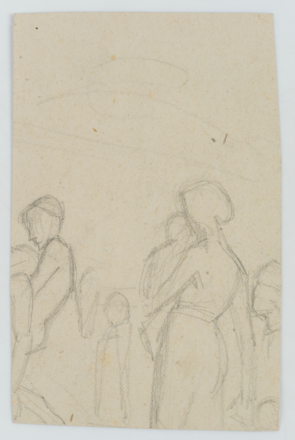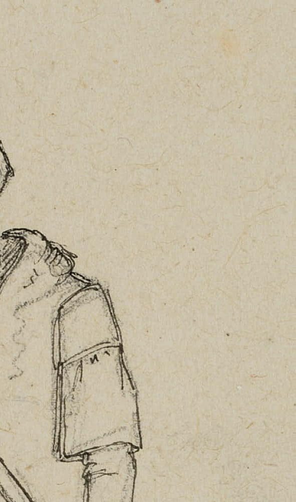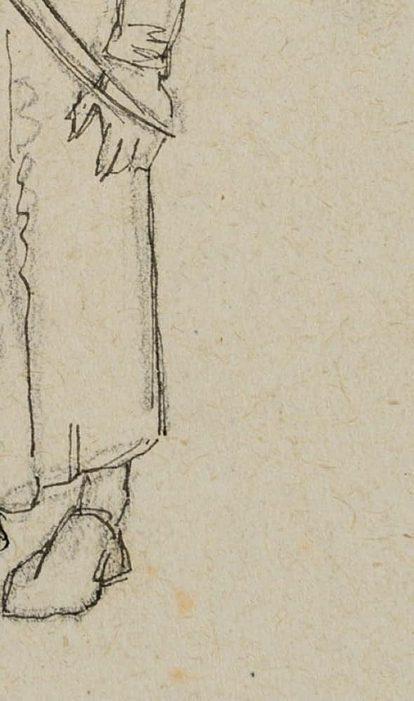 - Beschreibung: Das Studienblatt aus dem Skizzenbuch des dänischen Künstlers Rondahl zeigt eine ganzfigurige Darstellung eines orientalischen Kriegers mit Pelzmütze und Mantel. In seiner Schärpe steckt ein Säbel. Rückseitig sind skizzenhaft weitere Figuren dargestellt. Die Zeichnung stammt aus einer Sammlung von Historien- und Sagendarstellungen mit nordischen Szenen und Themen aus der Hand des dänischen Künstlers Rondahl, der sich besonders als Zeichner einen Namen gemacht hat. Er lieferte die Entwürfe für zahlreiche historische, archäologische und literarische Schriften.