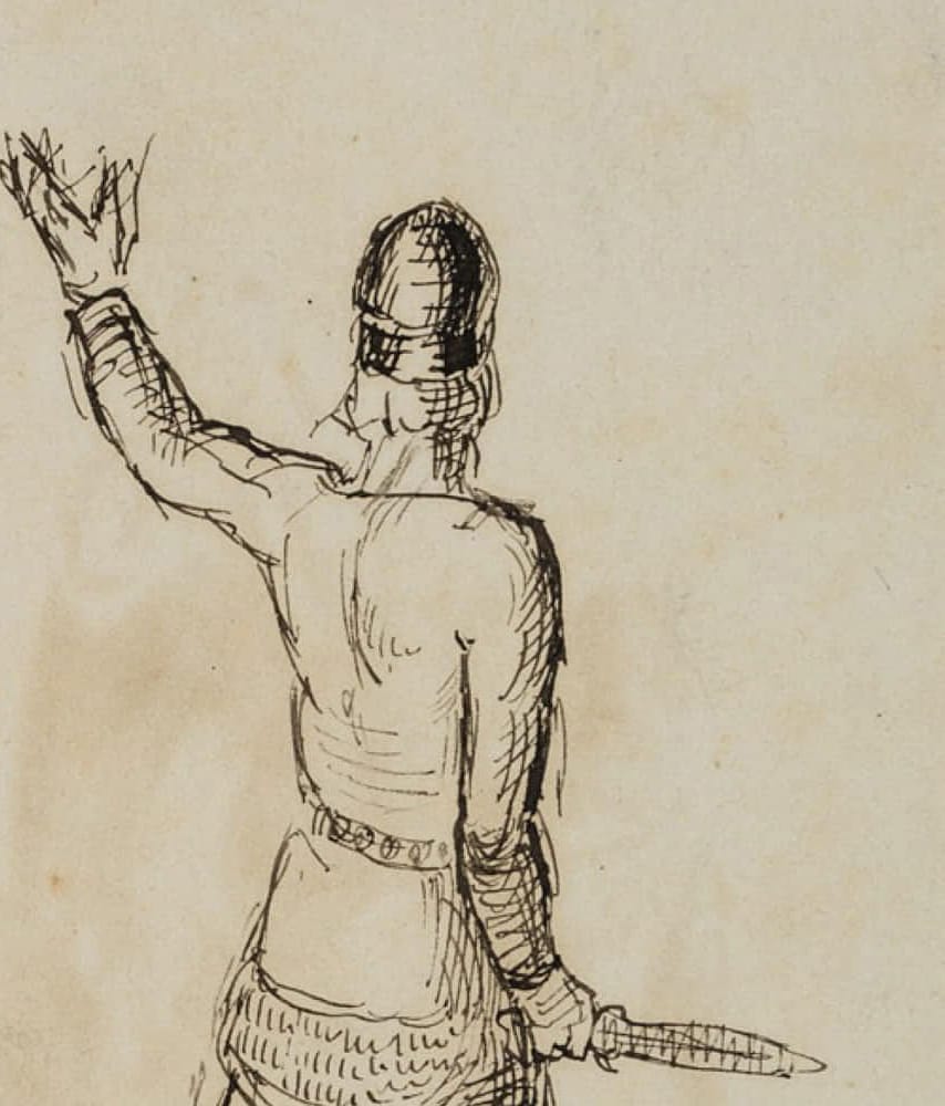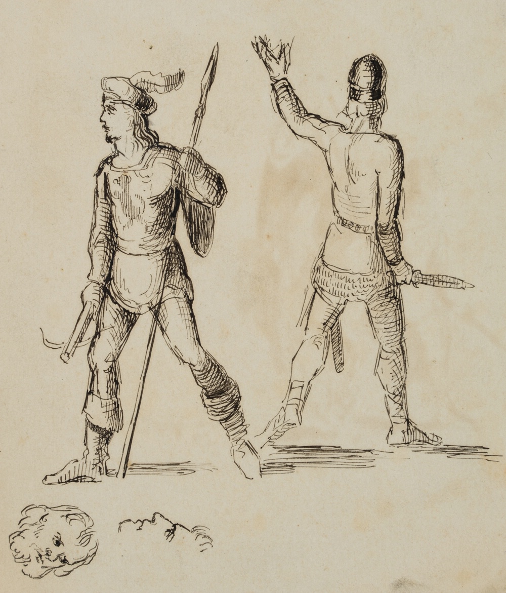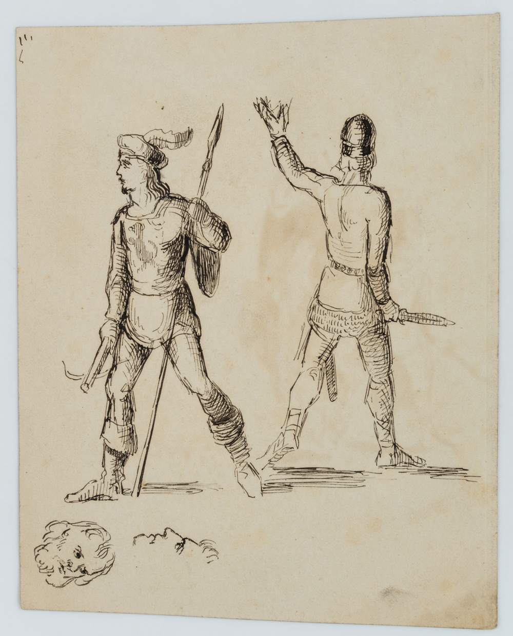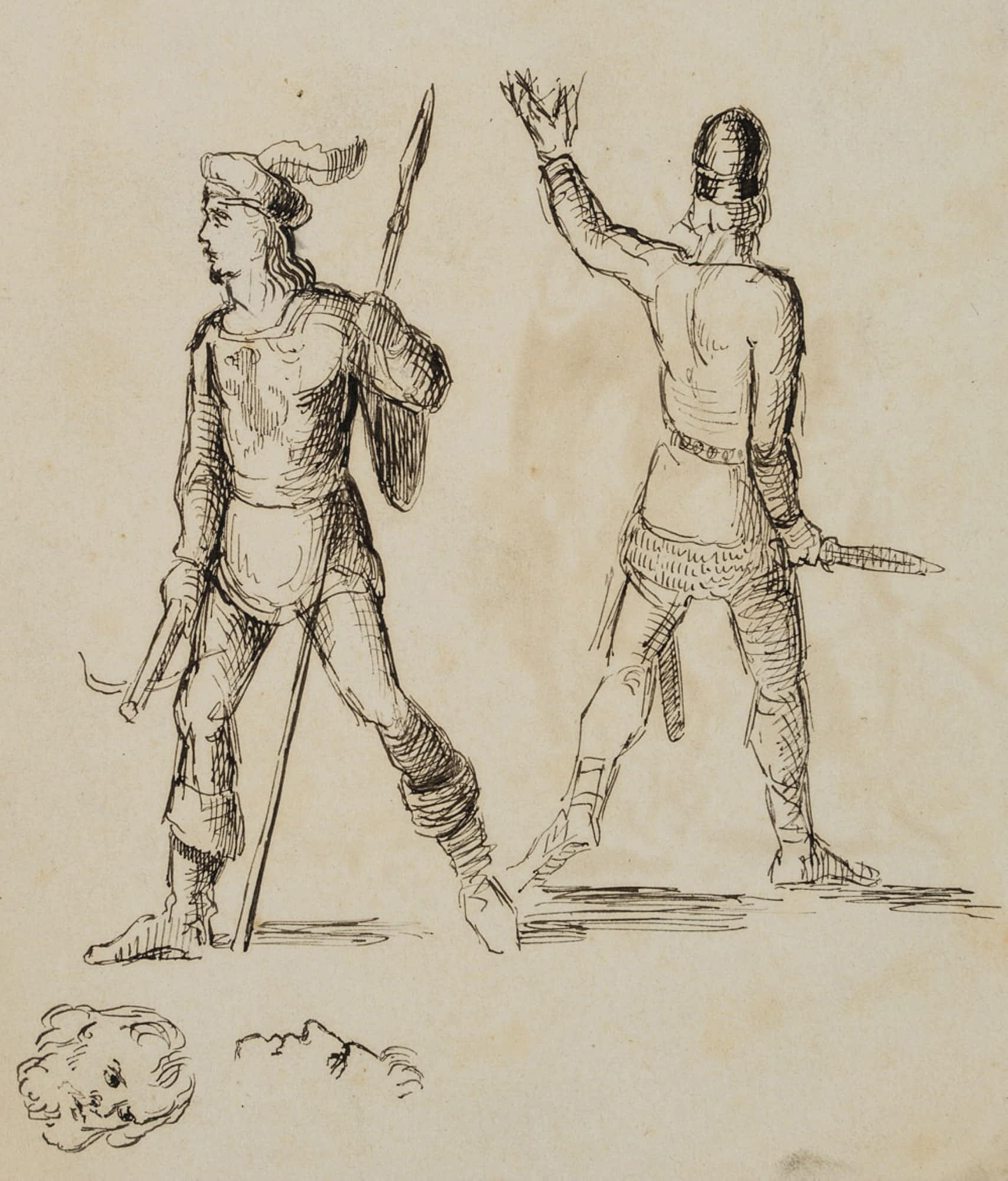 Emmery Rondahl (1858 Vordingborg – 1914 Copenhagen), Nordic warriors with crossbow, spear and sword, c. 1875, Pen drawing
