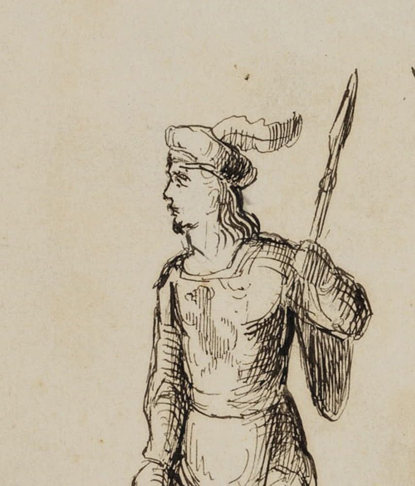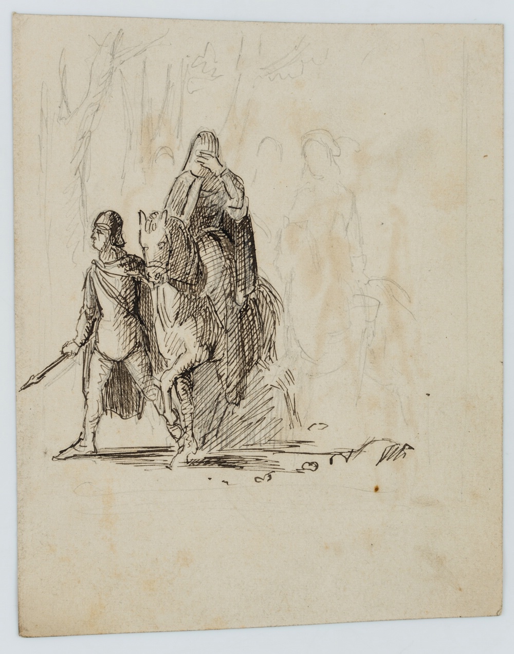 Studienblatt mit Krieger in nordischer Rüstung. Rückseitig ist ein Zug durch einen Wald zu sehen. Ein laufender Krieger begleitet eine Dame zu Pferd. Die Zeichnung stammt aus einer Sammlung von Historien- und Sagendarstellungen mit nordischen Szenen und Themen aus der Hand des dänischen Künstlers Rondahl, der sich besonders als Zeichner einen Namen gemacht hat. Er lieferte die Entwürfe für zahlreiche historische, archäologische und literarische Schriften.