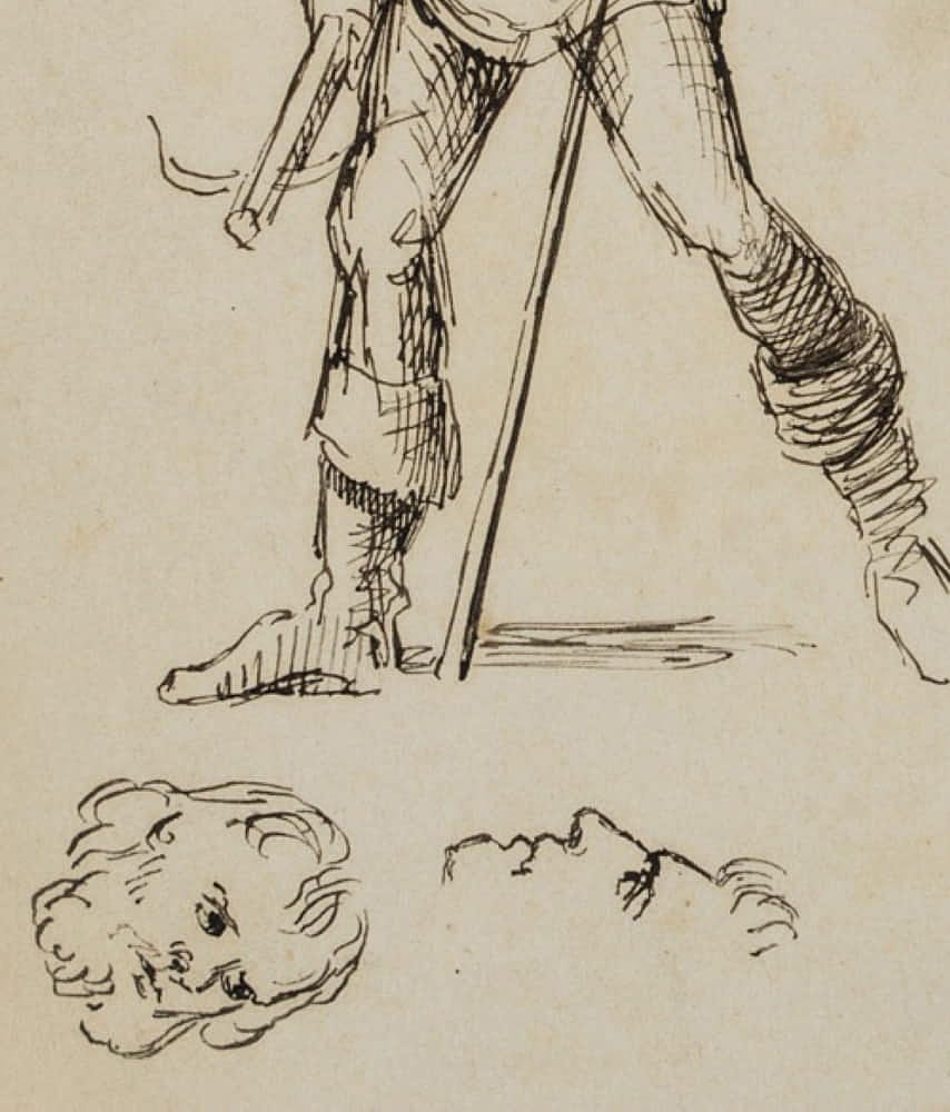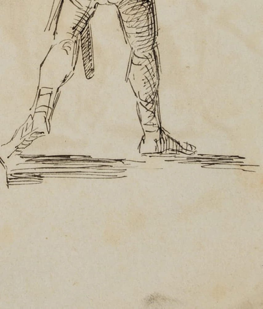 • Description: Study sheet with warrior in Nordic armour. On the reverse side a procession through a forest can be seen. A running warrior accompanies a lady on horseback. The drawing comes from a collection of history and saga depictions with Nordic scenes and themes from the hand of the Danish artist Rondahl, who made a name for himself especially as a draughtsman. He provided the designs for numerous historical, archaeological and literary writings.