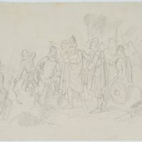 Studienblatt mit Kriegern in nordischer Rüstung, geschart um ihren Anführer, der den Kopf nachdenklich auf die Hand gestützt hat. Die Zeichnung stammt aus einer Sammlung von Historien- und Sagendarstellungen mit nordischen Szenen und Themen aus der Hand des dänischen Künstlers Rondahl (1858 Vordingborg – 1914 Kopenhagen), der sich besonders als Zeichner einen Namen gemacht hat. Er lieferte die Entwürfe für zahlreiche historische, archäologische und literarische Schriften.