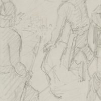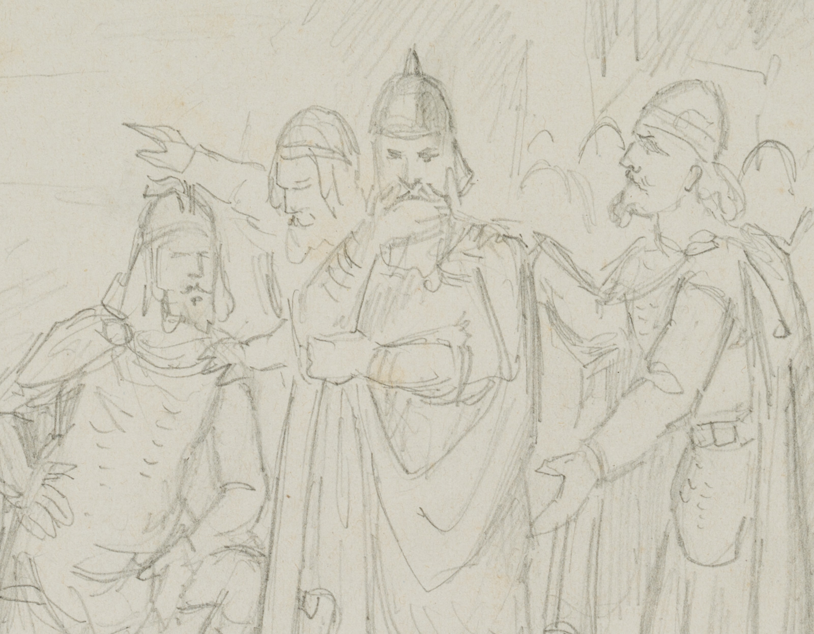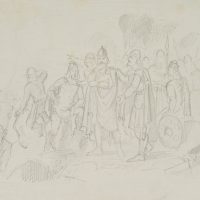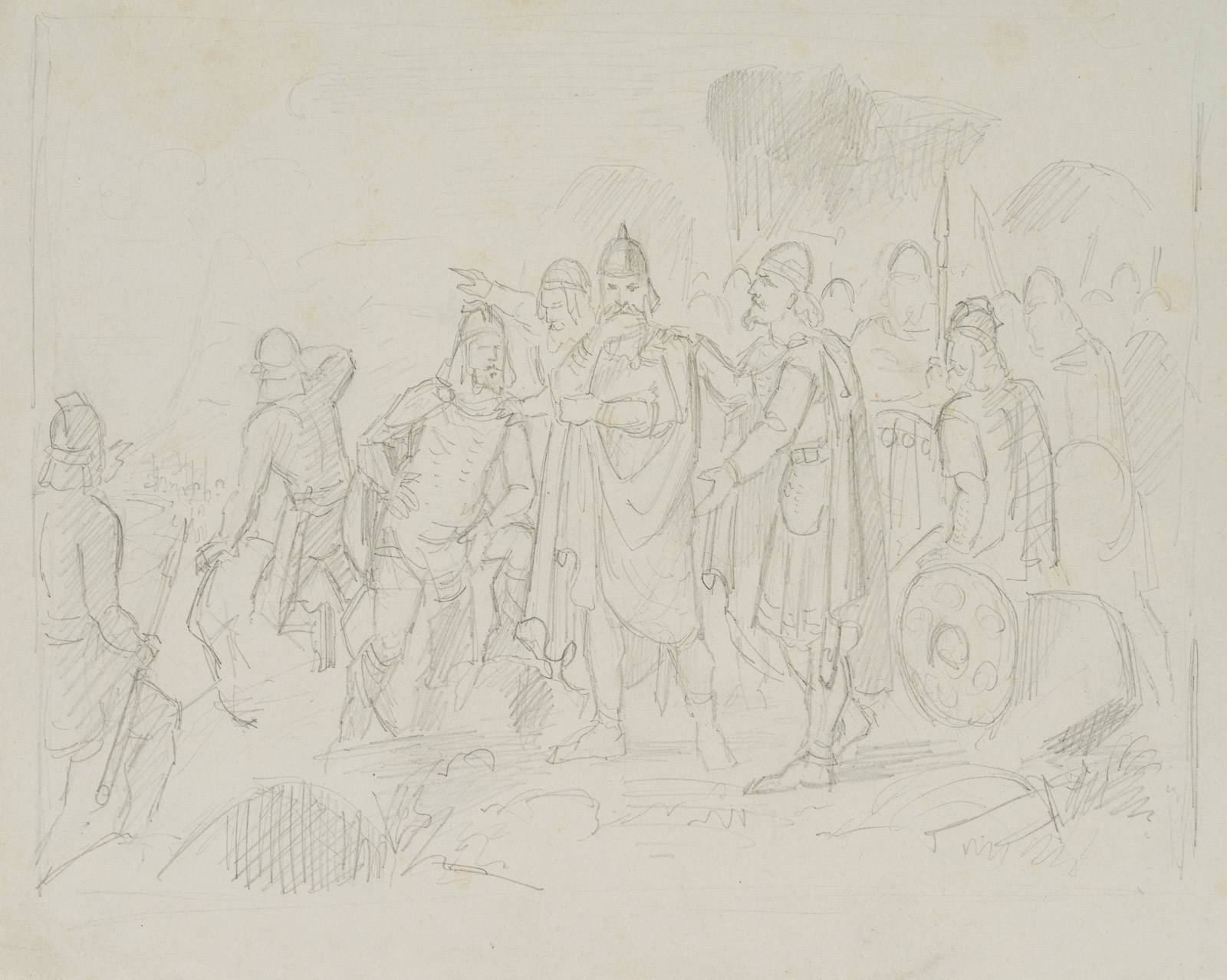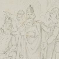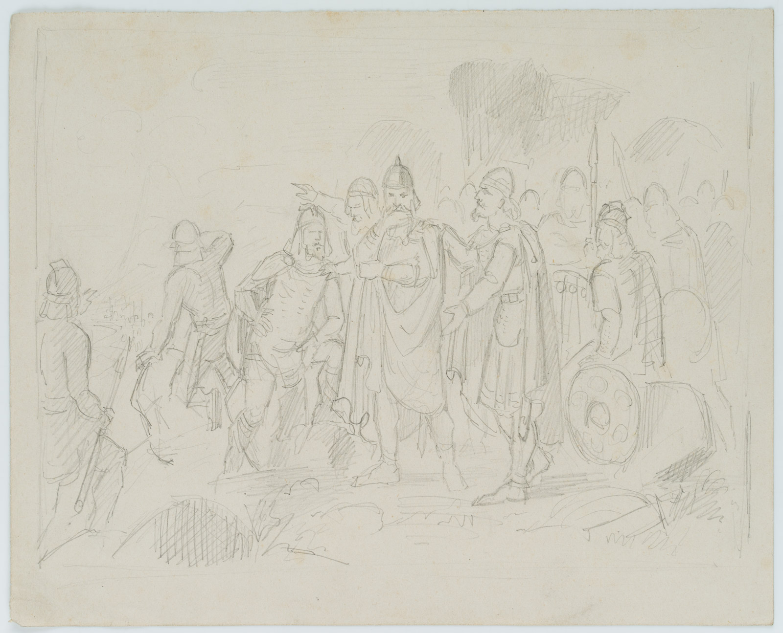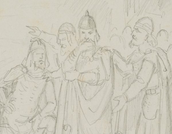 • Description: Study sheet with warriors in Nordic armour, gathered around their leader, who has his head resting pensively on his hand. The drawing is from a collection of history and saga depictions with Nordic scenes and themes from the hand of the Danish artist Rondahl (1858 Vordingborg – 1914 Copenhagen), who made a name for himself especially as a draughtsman. He provided the designs for numerous historical, archaeological and literary writings.