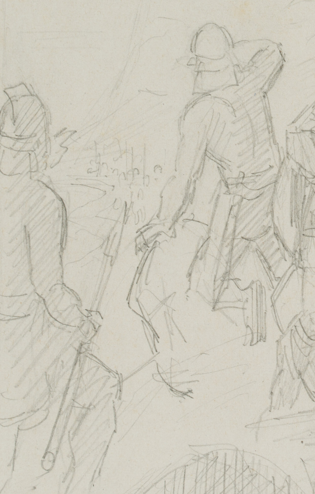 Emmery Rondahl (1858 Vordingborg – 1914 Copenhagen), Nordic warriors, lurking on a hill, perhaps illustration of a Nordic saga, c. 1880, Pencil