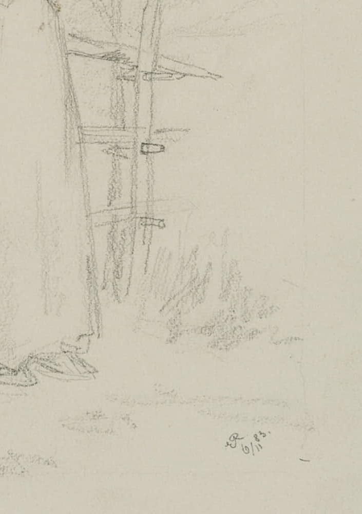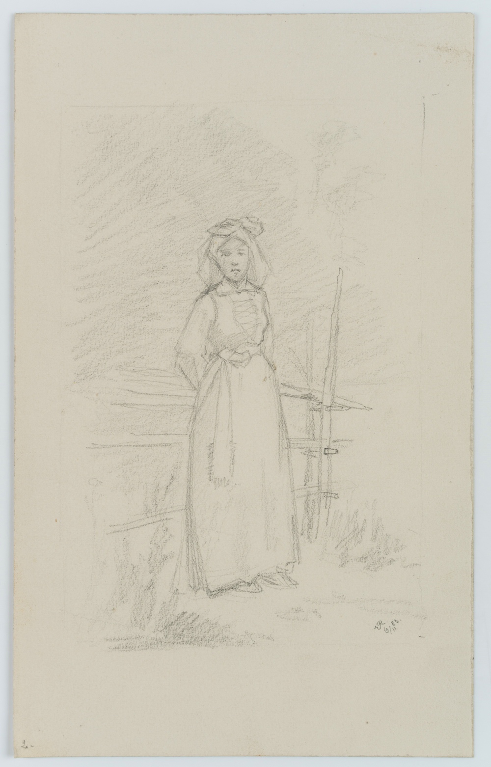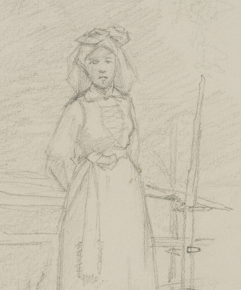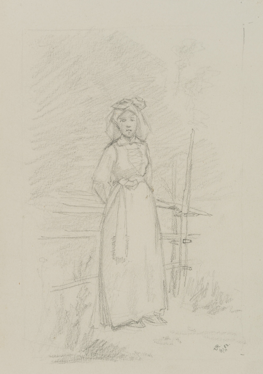Emmery Rondahl (1858 Vordingborg – 1914 Kopenhagen), Porträt einer Magd am Holzzaun, 1883, Bleistift