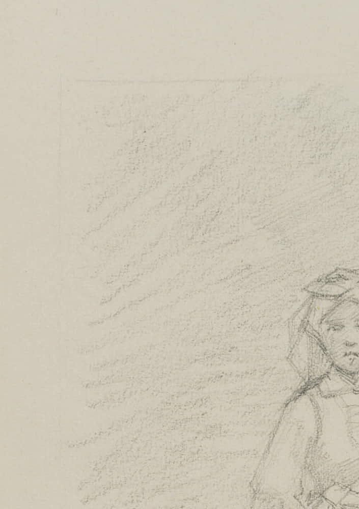 • Beschreibung: Porträtskizze einer jungen Frau in der bäuerlichen Tracht einer Magd. Das Blatt stammt aus dem Skizzenbuch des Künstlers und ist vermutlich als spontane Porträtstudie der jungen Frau entstanden, die kurz in ihrer Arbeit innehielt um Modell zu stehen. Die Zeichnung stammt aus einer Sammlung von Historien- und Sagendarstellungen mit nordischen Szenen und Themen aus der Hand des dänischen Künstlers Rondahl, der sich besonders als Zeichner einen Namen gemacht hat. Er lieferte die Entwürfe für zahlreiche historische, archäologische und literarische Schriften.