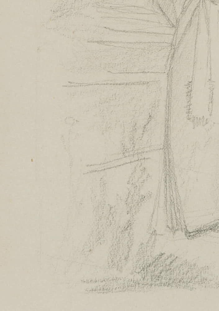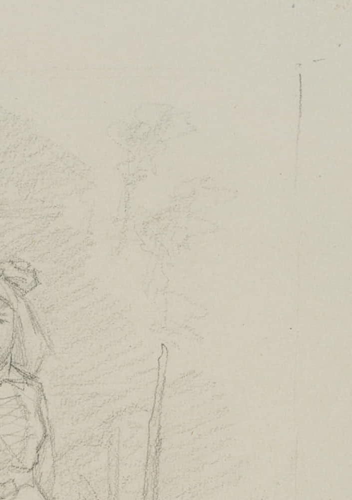 • Description: Portrait sketch of a young woman in the rural costume of a maid. The sheet comes from the artist’s sketchbook and was probably made as a spontaneous portrait study of the young woman, who paused briefly in her work to stand as a model. The drawing comes from a collection of history and saga depictions with Nordic scenes and themes from the hand of the Danish artist Rondahl, who made a name for himself especially as a draughtsman. He provided the designs for numerous historical, archaeological and literary writings.
