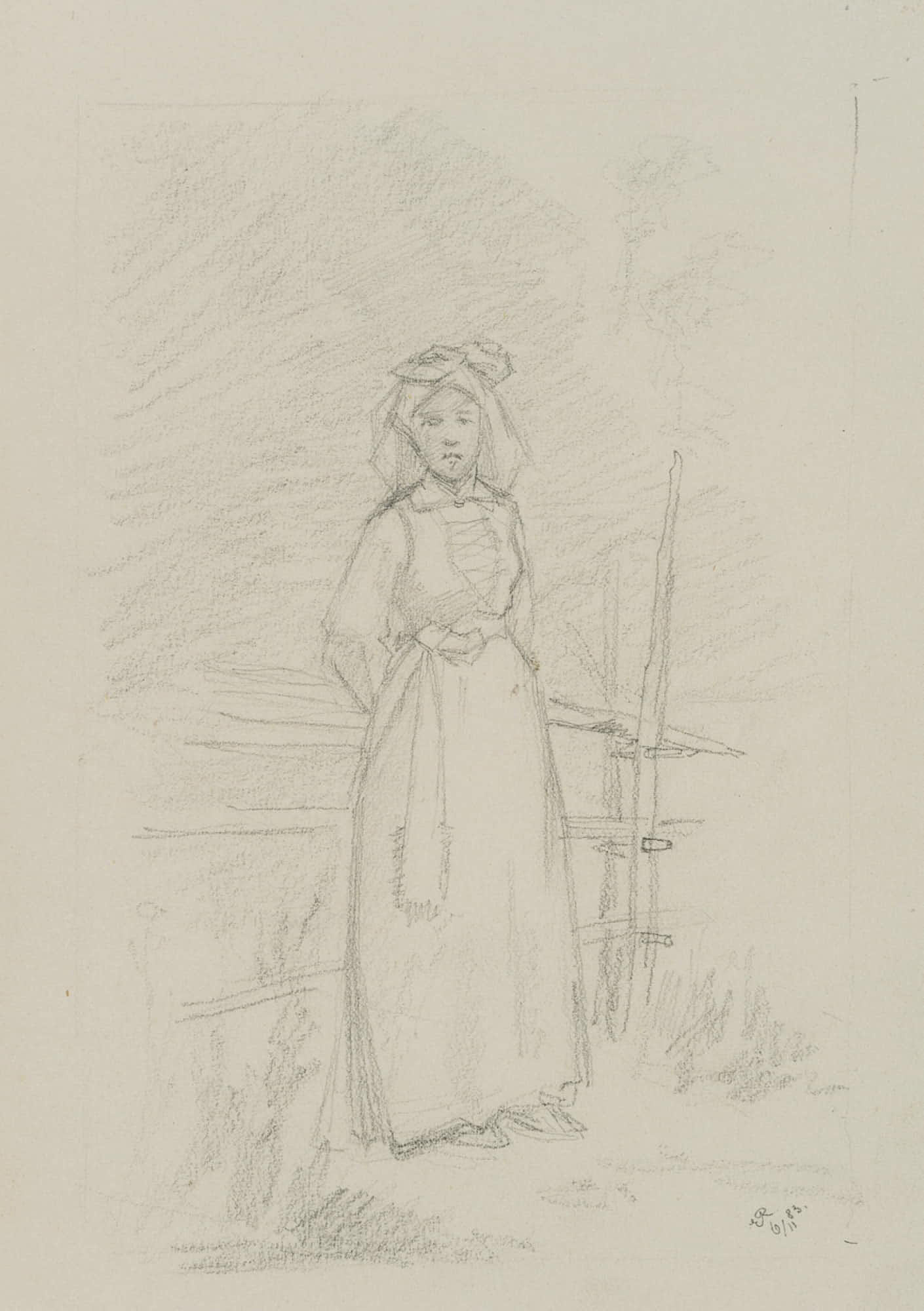 Emmery Rondahl (1858 Vordingborg – 1914 Copenhagen), Portrait of a maid at the wooden fence, 1883, Pencil