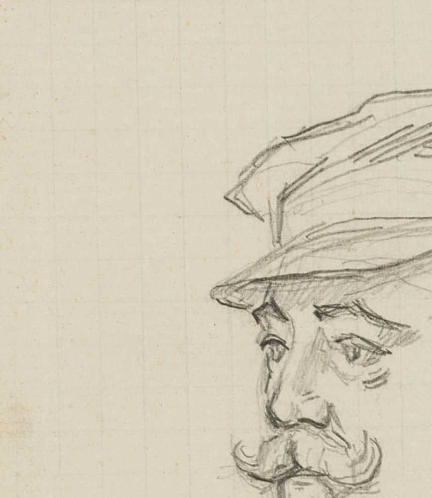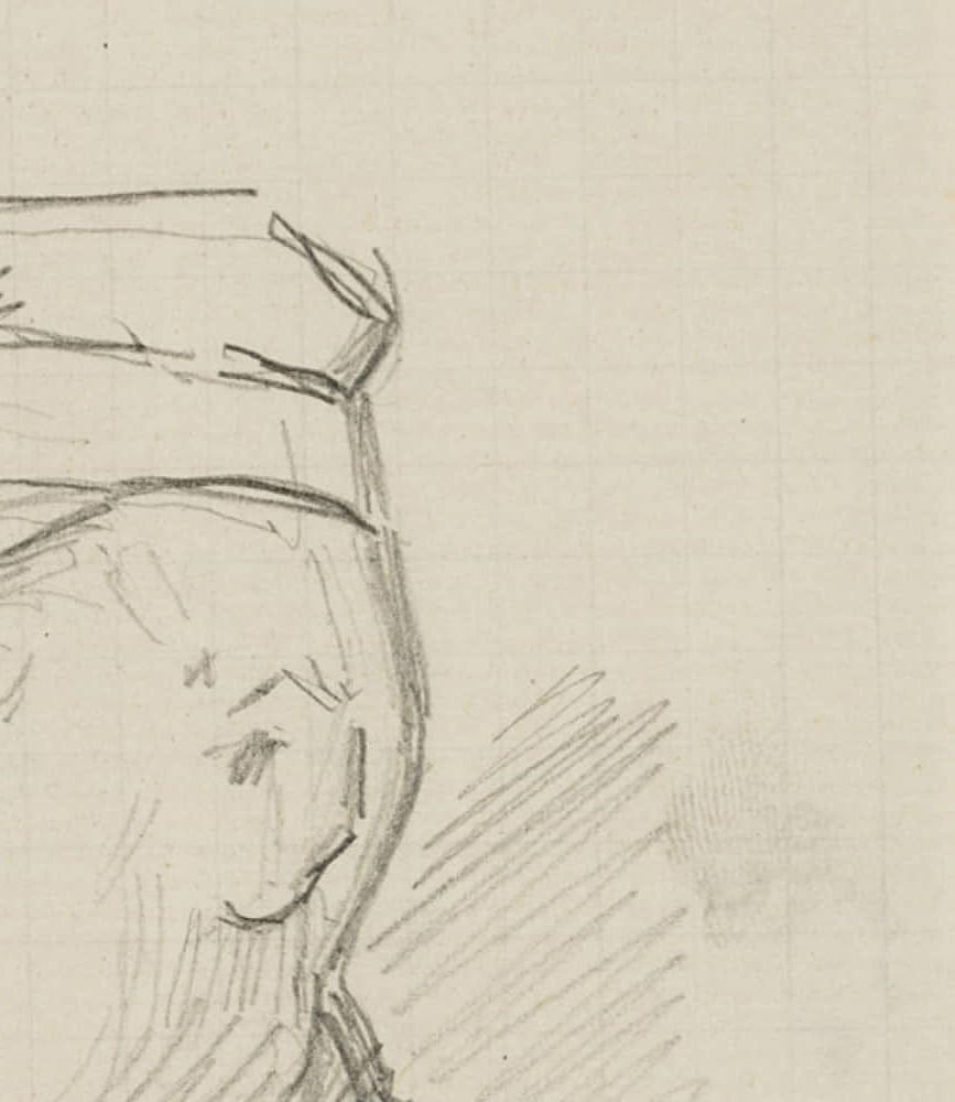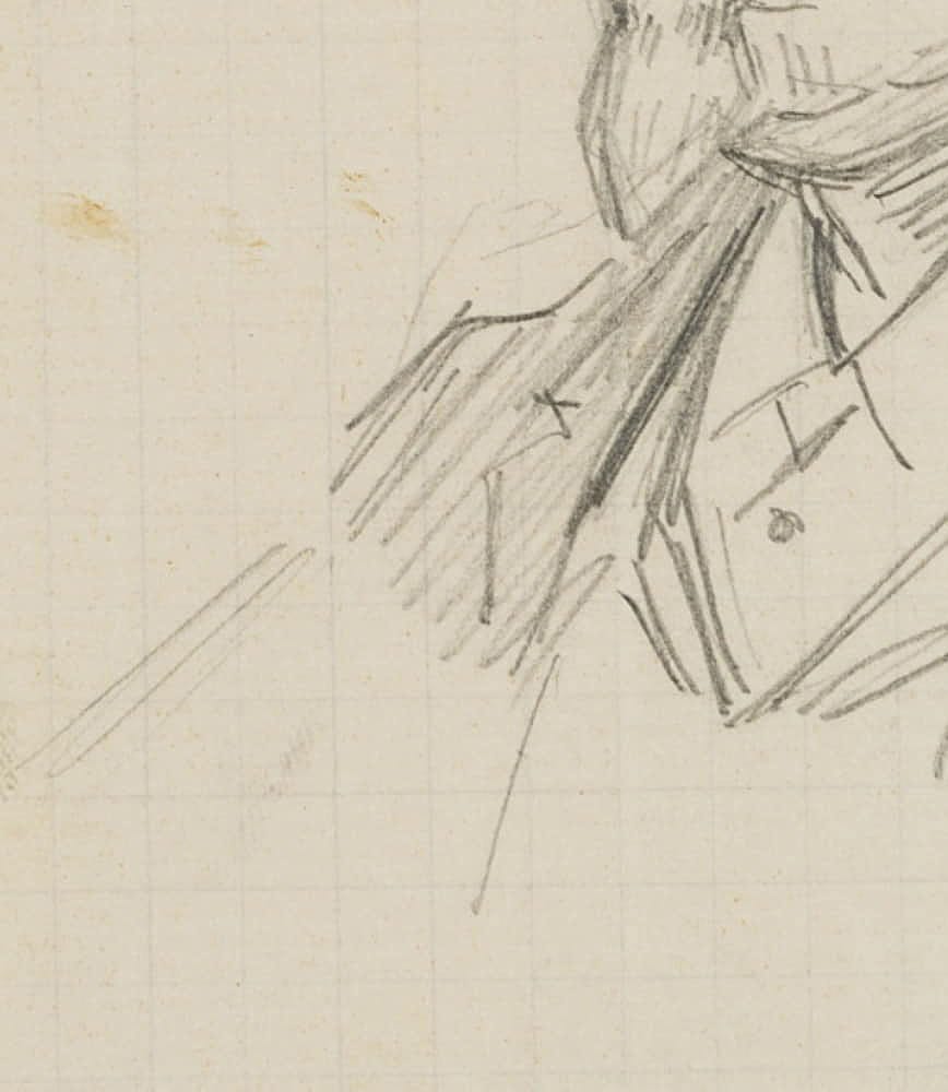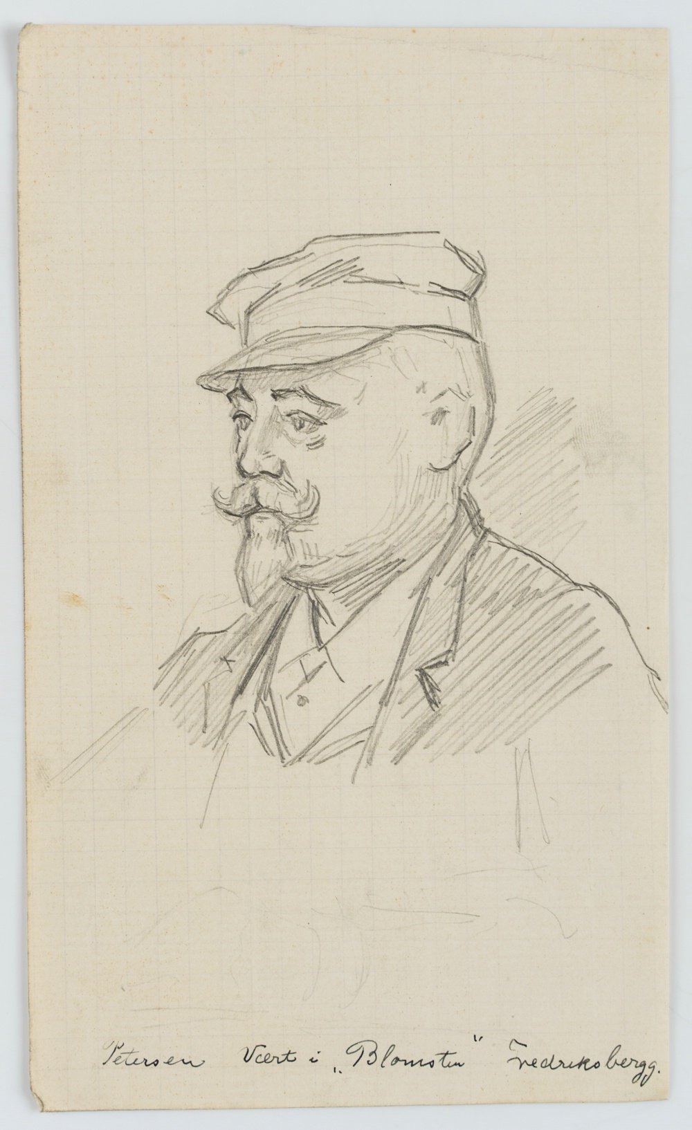 - Description: Portrait drawn with quick strokes from the artist’s sketchbook. Showing a gentleman in half-profile with an elaborate moustache. The drawing is from a collection of history and saga depictions with Nordic scenes and themes from the hand of the Danish artist Rondahl, who made a name for himself especially as a draughtsman. He provided the designs for numerous historical, archaeological and literary writings.