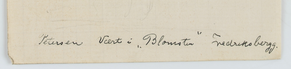 - Inscription: Inscribed in ink at the bottom: “Petersen Ucert[?] i “Blomster” Frederiksbergg