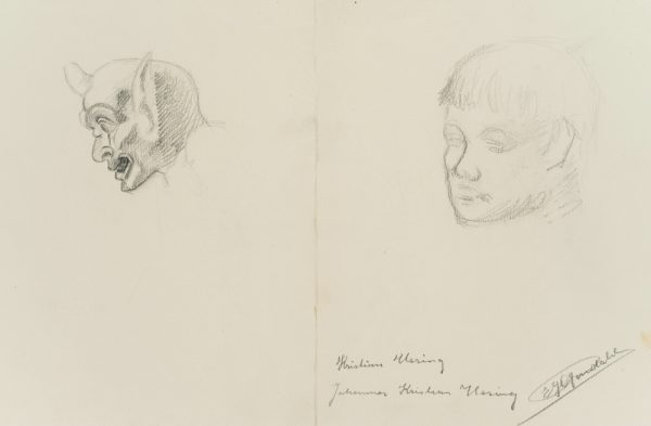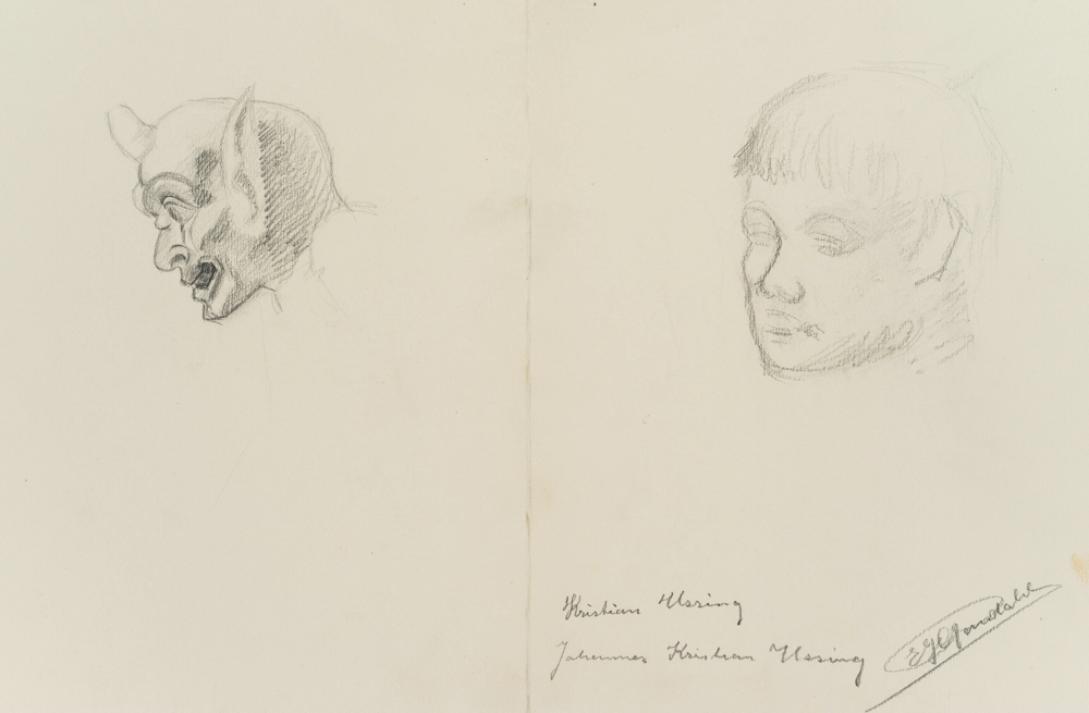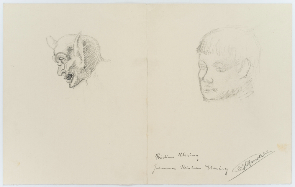Emmery Rondahl (1858 Vordingborg – 1914 Copenhagen), Portrait sketch and devil mask, c. 1910, Pencil