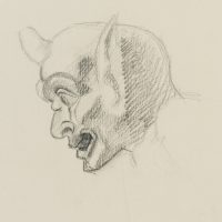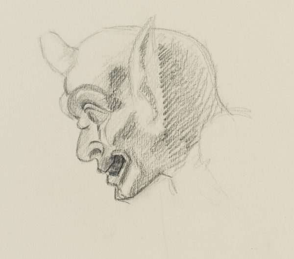 - Description: Folded in the centre Sketchy drawing of a playful devil’s mask, reminiscent of a historicist gargoyle based on a medieval model.