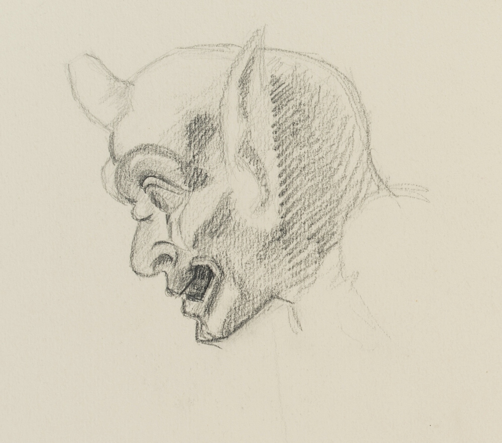 - Beschreibung: mittig gefaltet Skizzenhafte Zeichnung einer verspielten Teufelsmaske, die an einen historistischen Wasserspeier nach mittelalterlichem Vorbild erinnert.