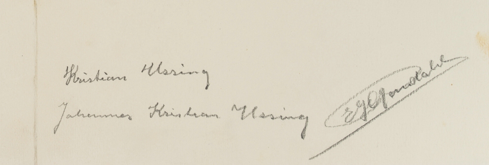 - Inscription: On the right is a sketch of a portrait of a boy, marked “Kristian Ussing | Johannes Kristian Ussing” at the bottom. Perhaps this is the son of Johannes Blom Ussing (1883-1929) and Sigrid Marie Margrethe Rondahl (1886-1962), the artist’s daughter, born in Roskilde in 1908.