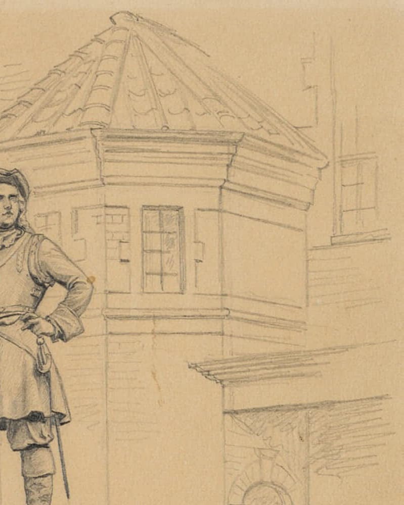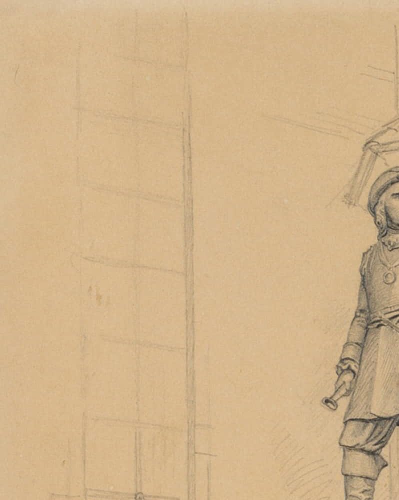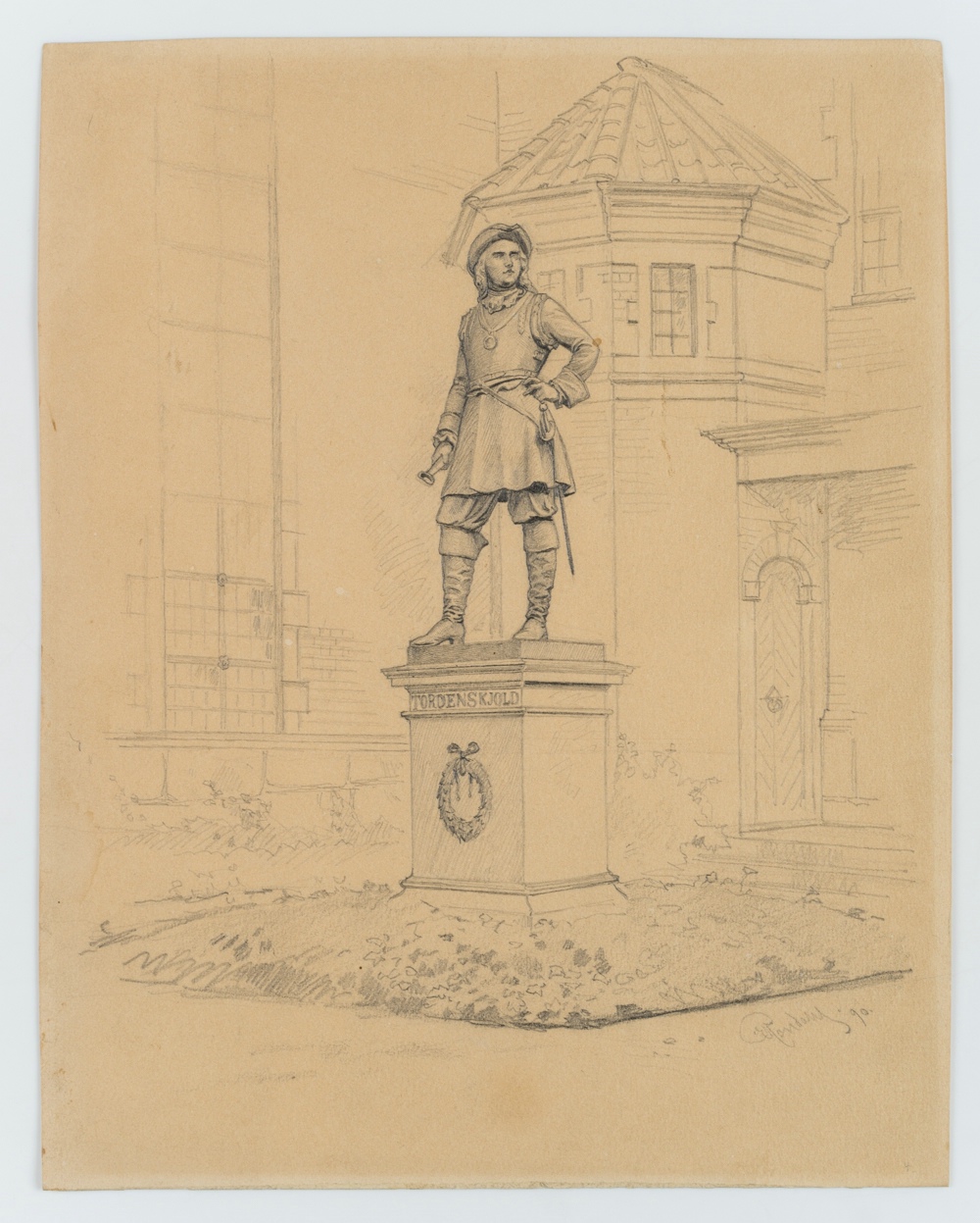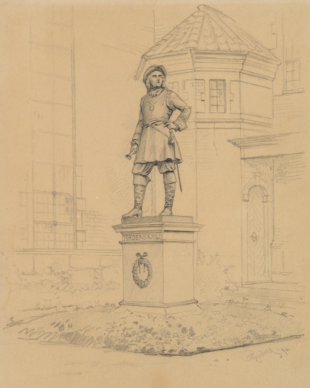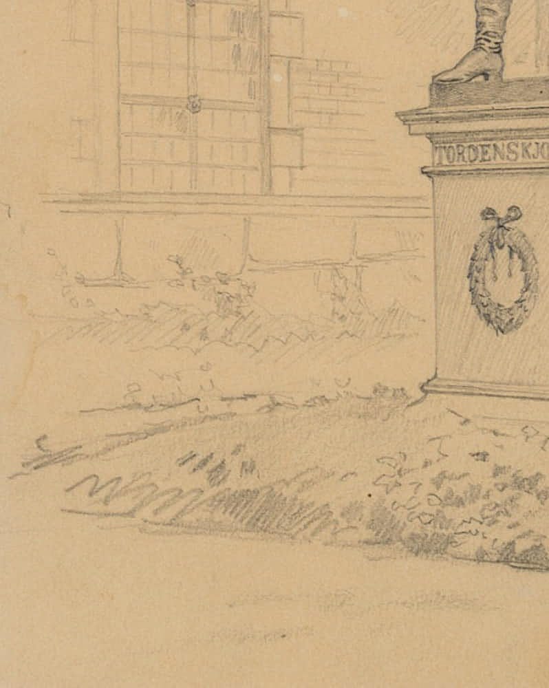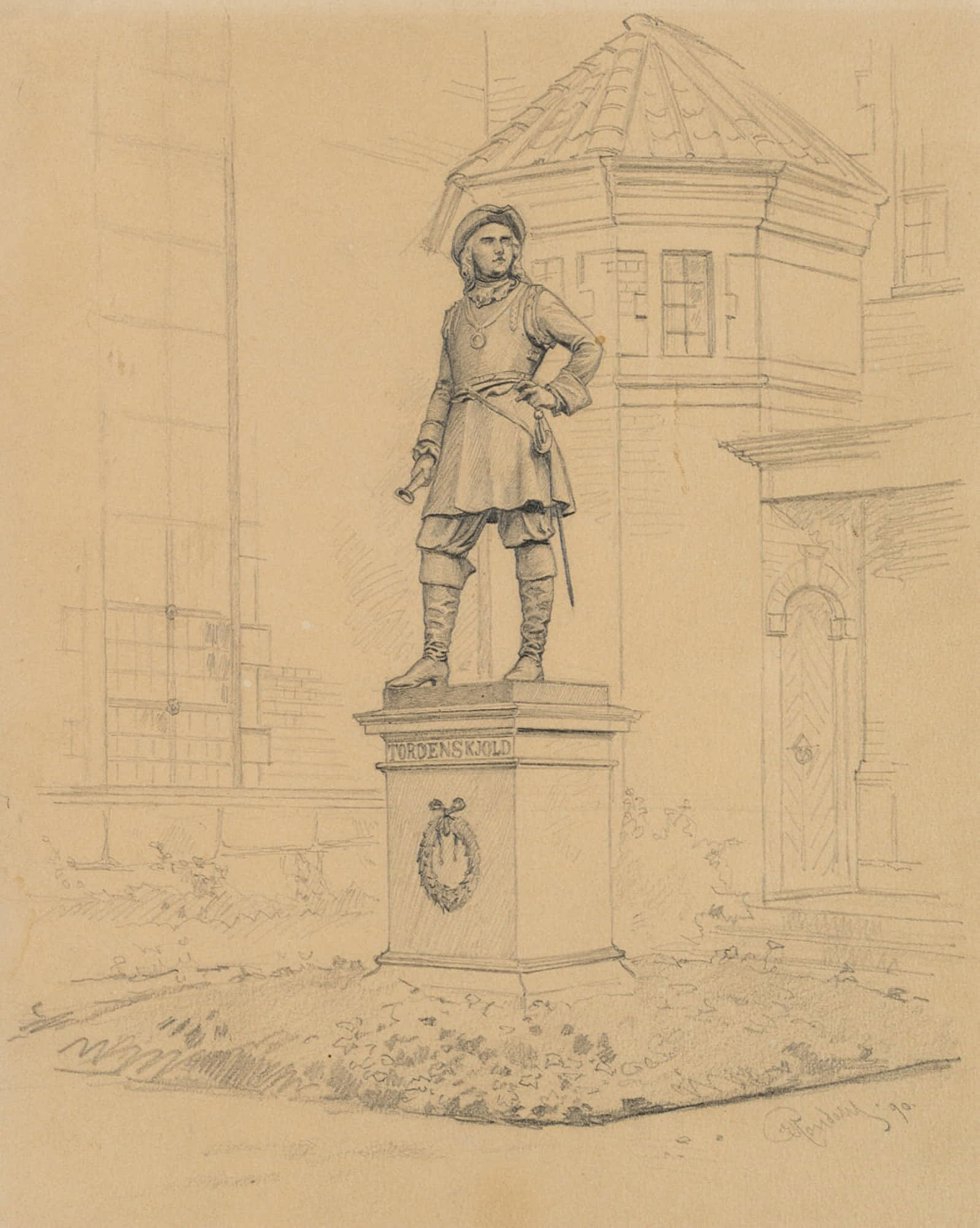 - Description: From the sketchbook of the Danish artist Rondahl, this sheet shows the statue of Tordenskiold, who rendered outstanding service as a naval officer in the Great Northern War.