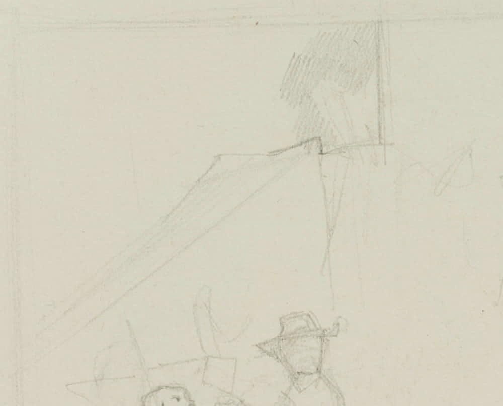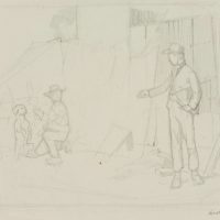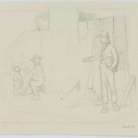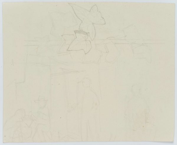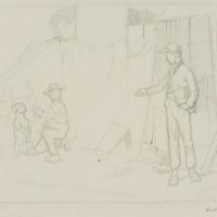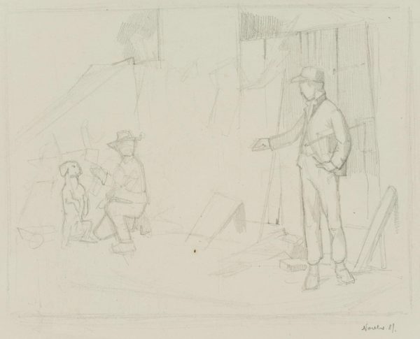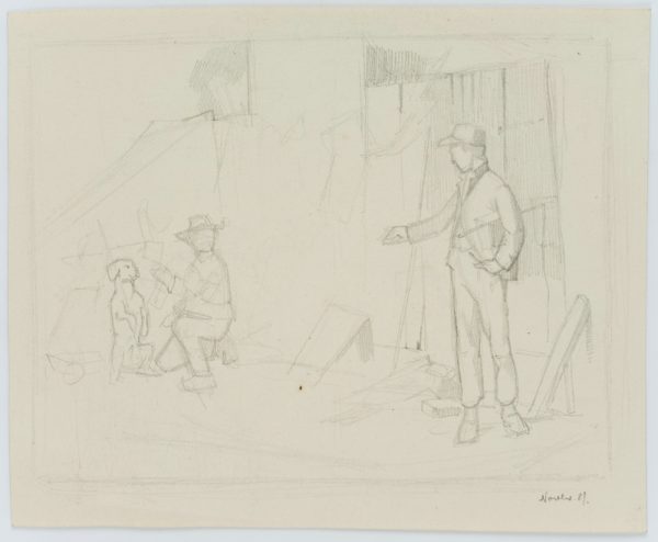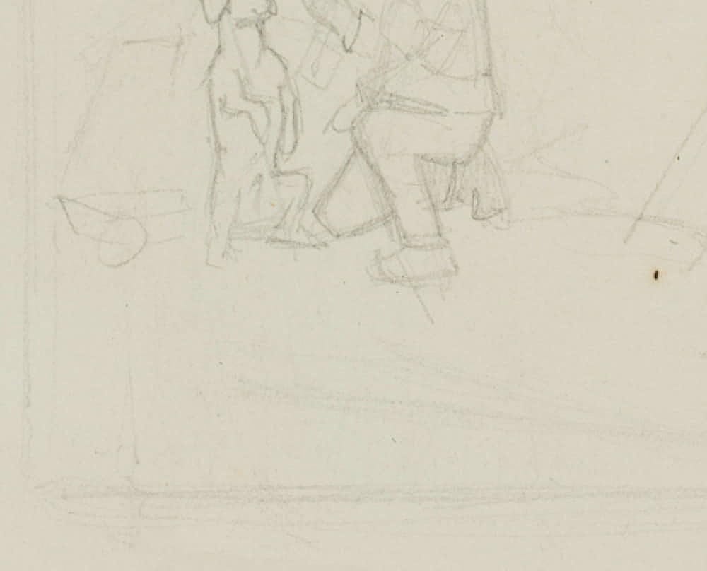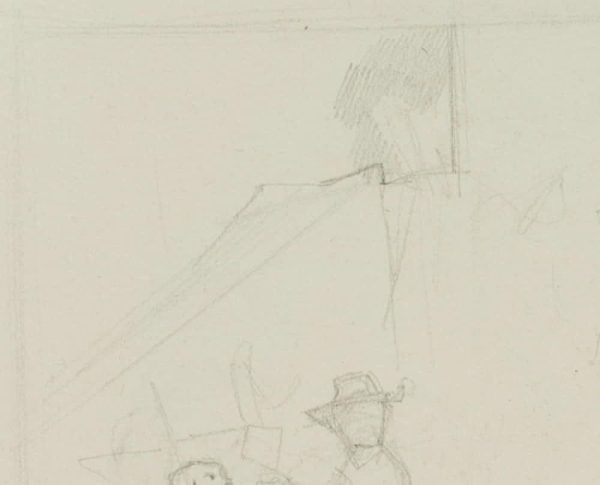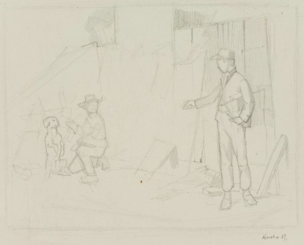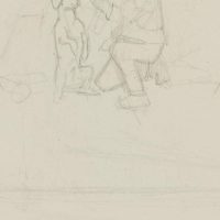 - Description: From the artist’s sketchbook comes this small figure study. A man enters a room where he discovers another man with a dog. Other figures and ivy leaves are visible in sketches on the reverse. The drawing comes from a collection of history and saga depictions with Nordic scenes and themes by the hand of the Danish artist Rondahl, who made a name for himself especially as a draughtsman. He provided the designs for numerous historical, archaeological and literary writings.