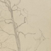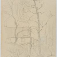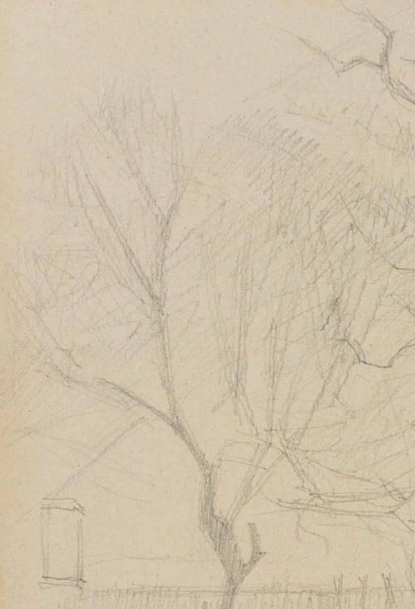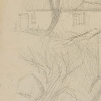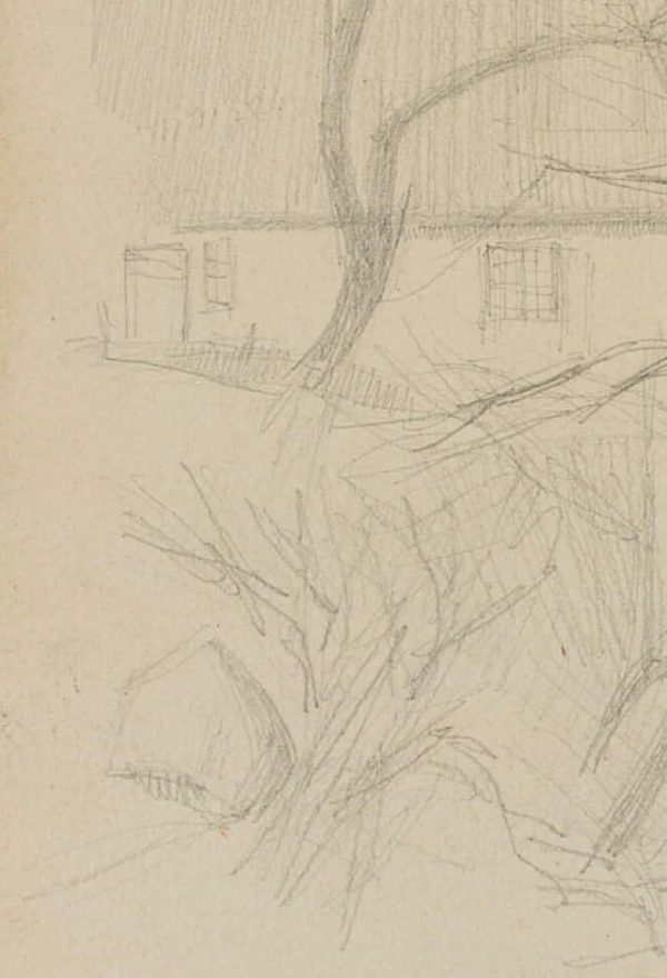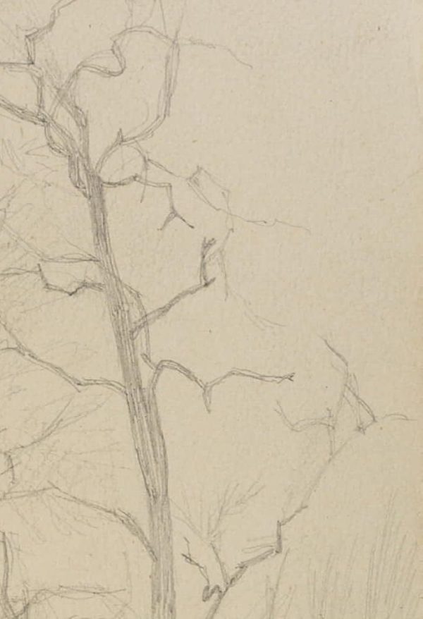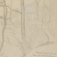 - Beschreibung: Mit schnellen Strichen gefertigte Naturskizze mit winterlich kargen Bäumen. Links ist ein Gebäude zu sehen, das durch die Beischrift unten rechts als Wassermühle identifiziert werden kann. Die Zeichnung stammt aus einer Sammlung von Historien- und Sagendarstellungen mit nordischen Szenen und Themen aus der Hand des dänischen Künstlers Rondahl, der sich besonders als Zeichner einen Namen gemacht hat. Er lieferte die Entwürfe für zahlreiche historische, archäologische und literarische Schriften.