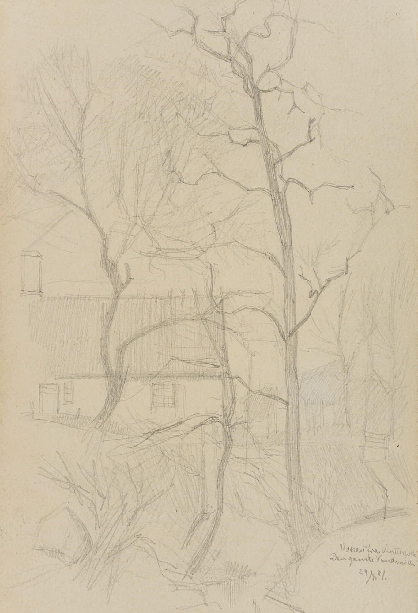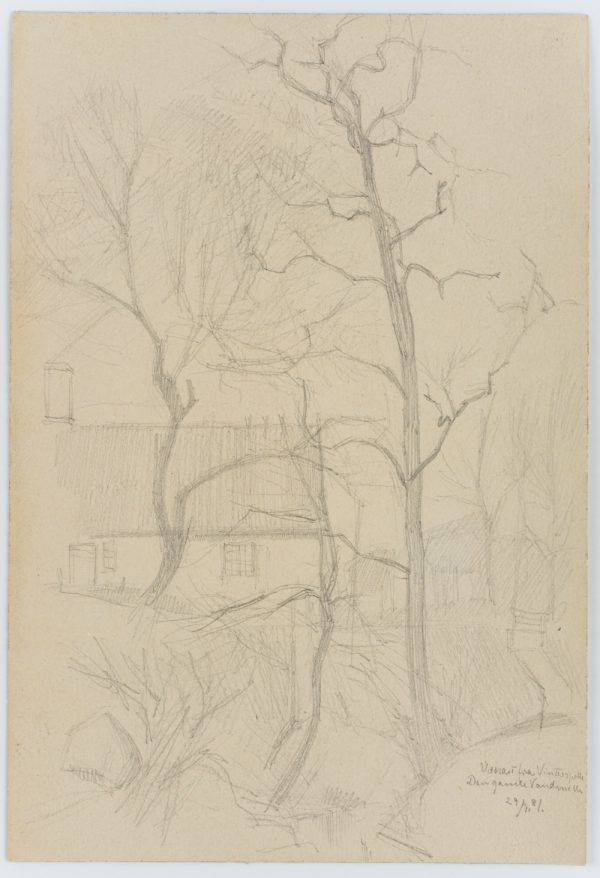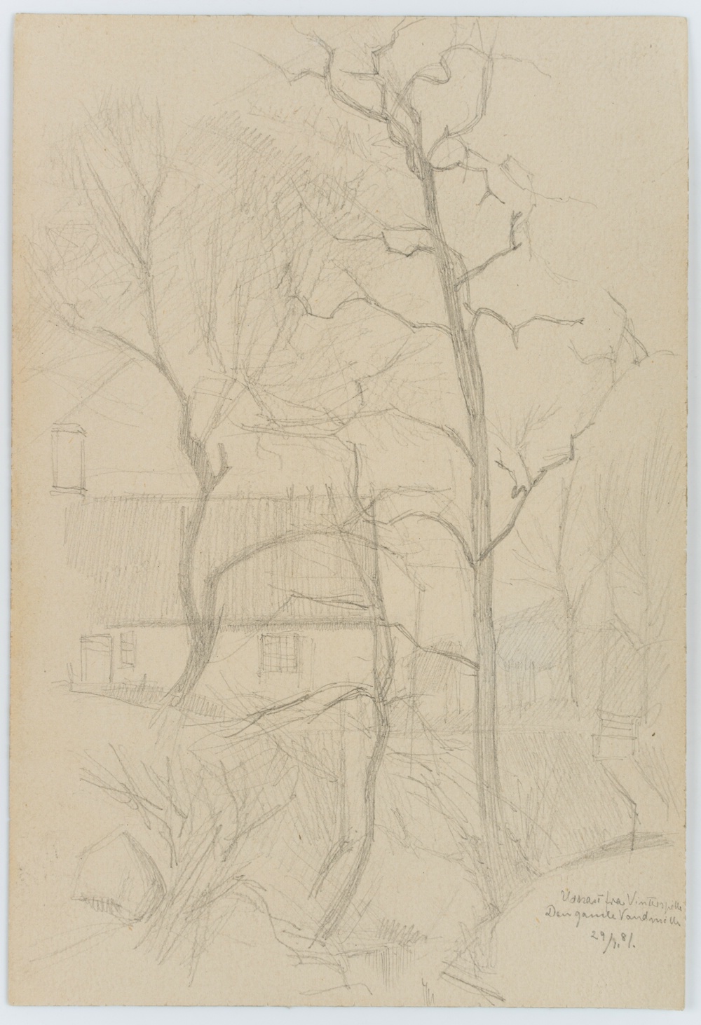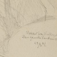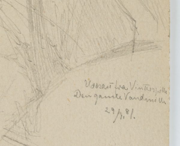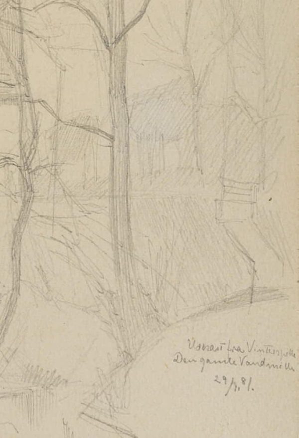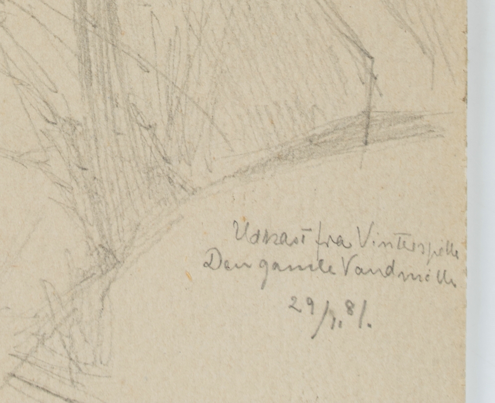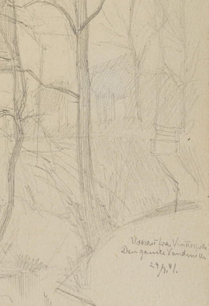 - Description: Nature sketch made with quick strokes with wintry sparse trees. On the left is a building, which can be identified as a water mill by the inscription on the lower right. The drawing comes from a collection of history and saga depictions with Nordic scenes and themes from the hand of the Danish artist Rondahl, who made a name for himself especially as a draughtsman. He provided the designs for numerous historical, archaeological and literary writings.