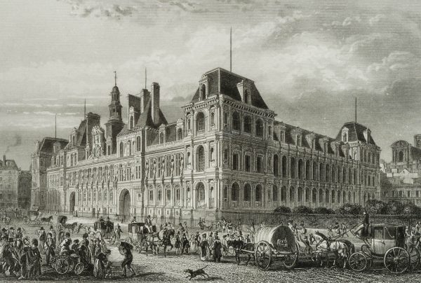 Émile Rouargue (um 1795 – 1865 ebd.), Blick auf das Rathaus Hôtel de Ville von Paris und den belebten Vorplatz, 19. Jahrhundert, Stahlstich