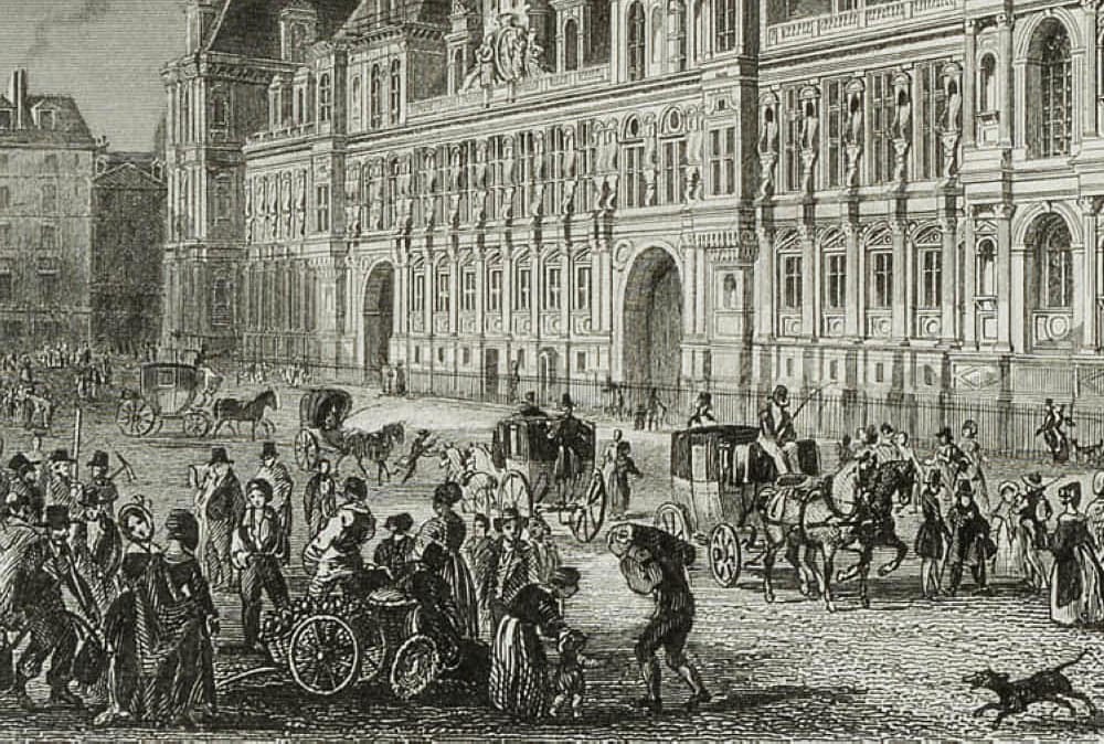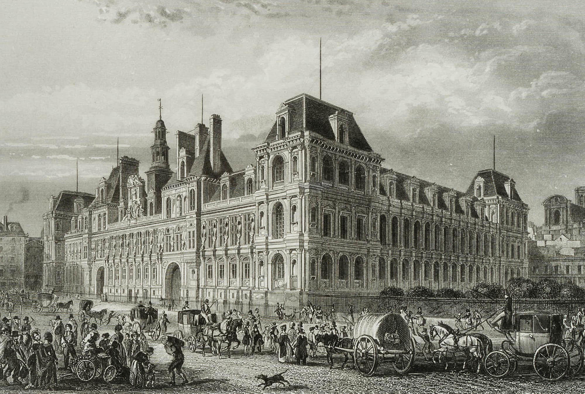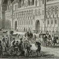 Émile Rouargue (around 1795 – 1865 ibid.), View of the Hôtel de Ville city hall of Paris and the lively forecourt, 19th century, Steel engraving