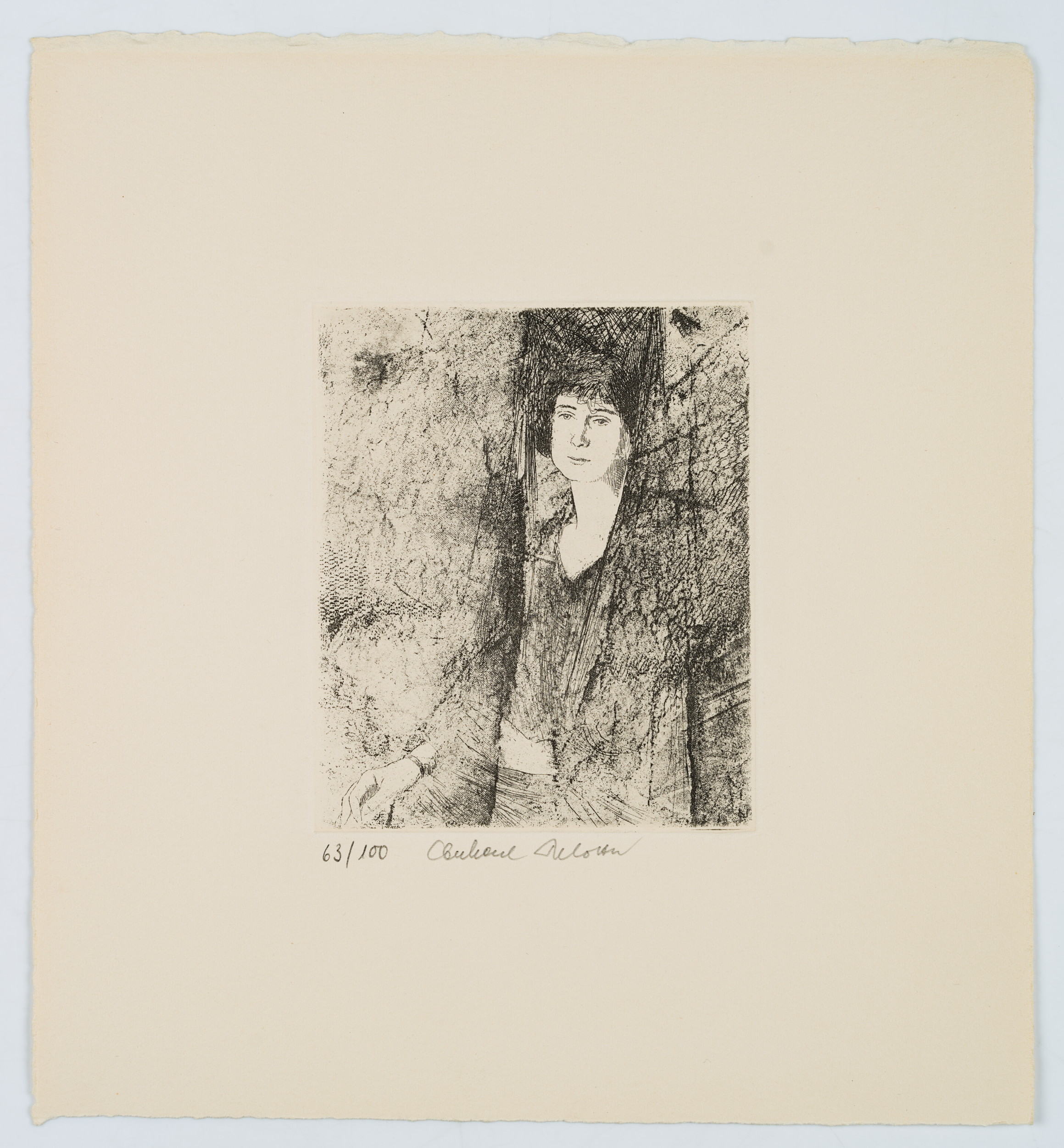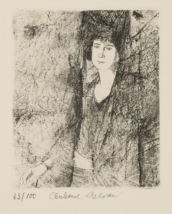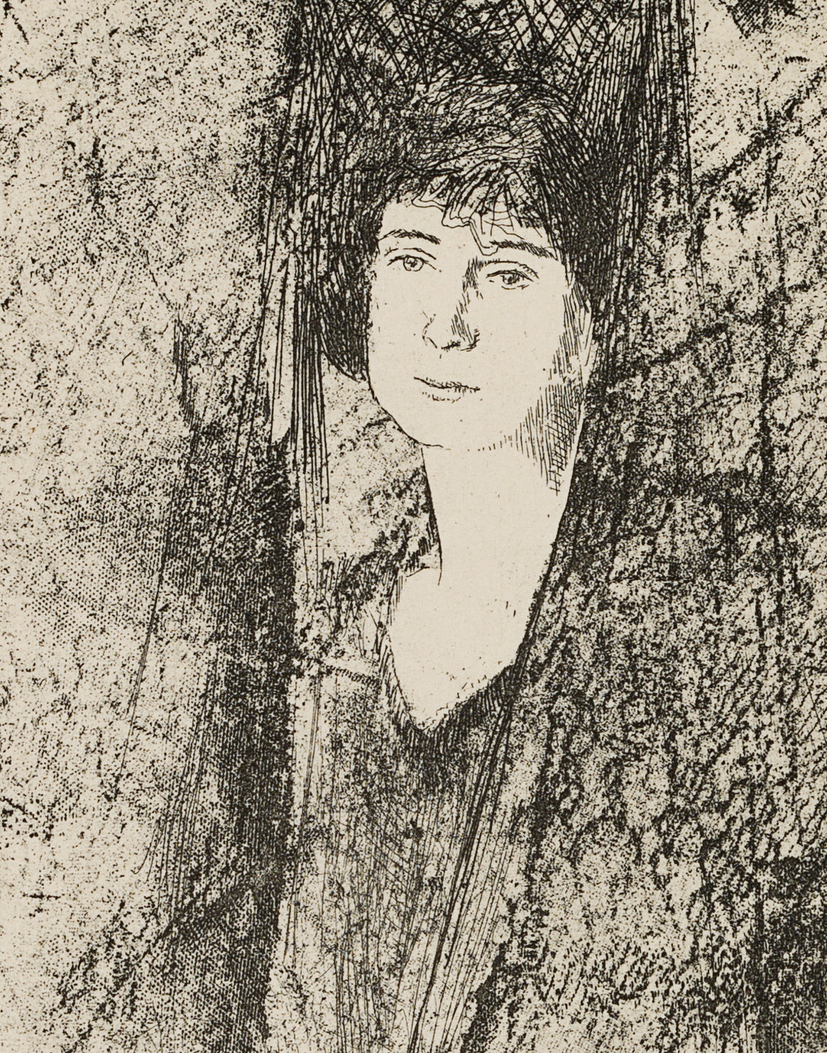 - Description: Charming etching depicting a woman with a bonnet.