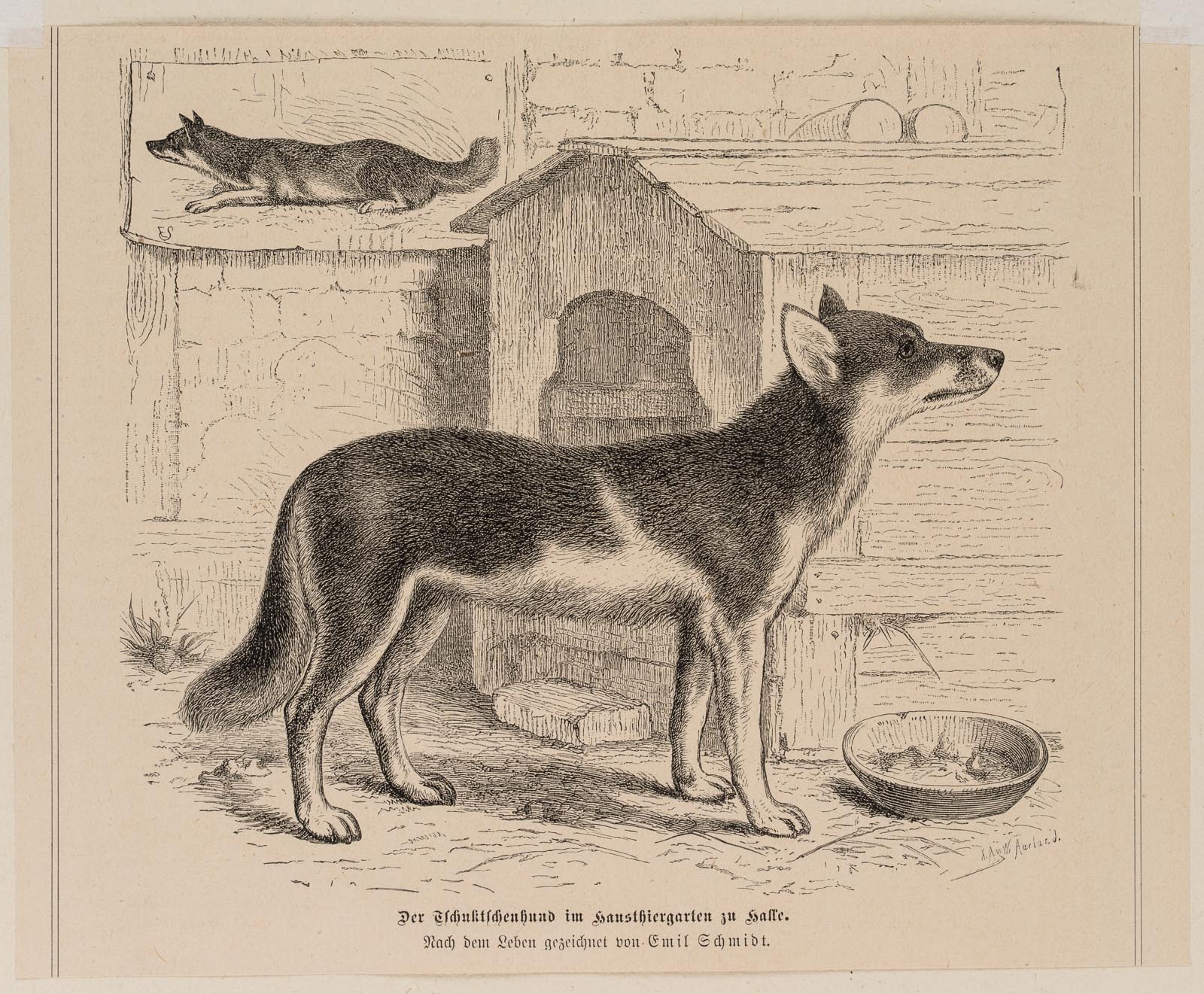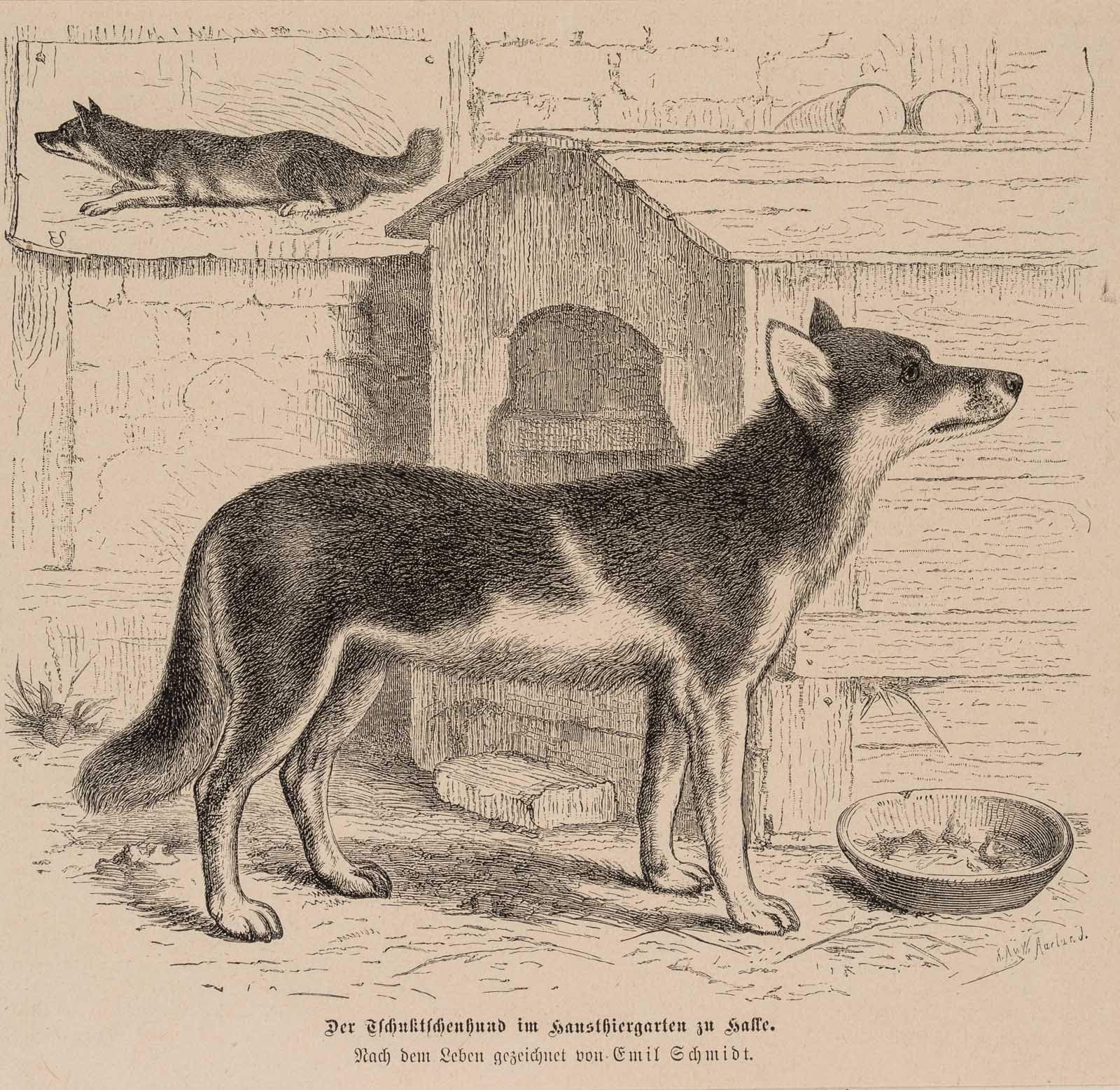 - Description: From the series ‘Blätter und Blüthen’, a series of the illustrated magazine ‘Die Gartenlaube’, issue 50, year 1882. The Tschukotskaja Jesdowaja, also “Tschuktschen-Laika”, is a breed of dog from Siberia, used by the Tschuktschen, an indigenous people of the Russian Far East, as a draught dog, sledge dog and working dog.