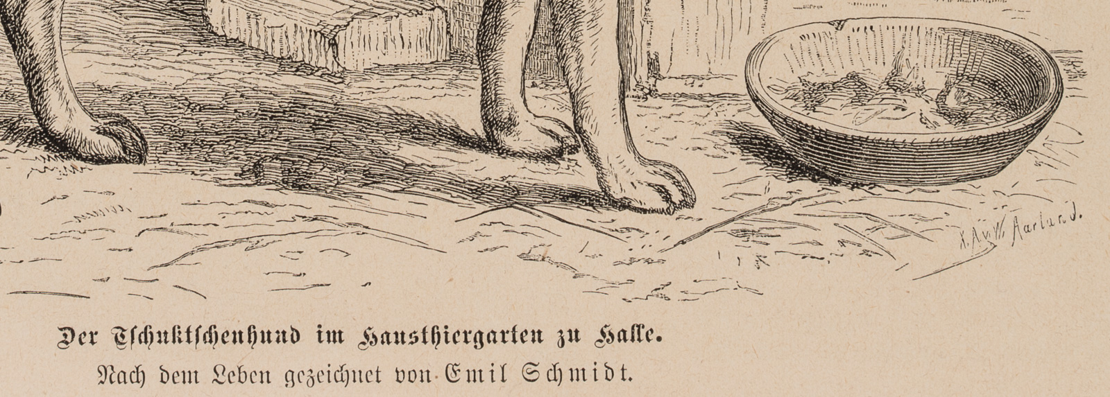 - Inscription: Signed lower right in the image “A. W [?] Aarland”. Inscribed below with “Der Tschuktschenhund im Hausthiergarten zu Halle. Drawn from life by Emil Schmidt”.