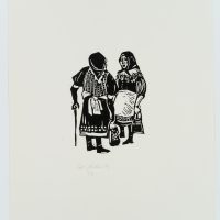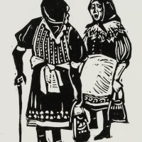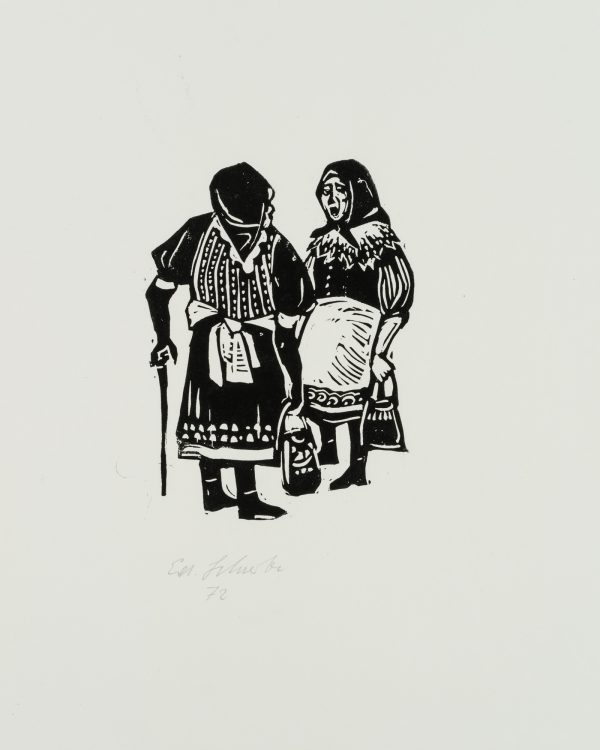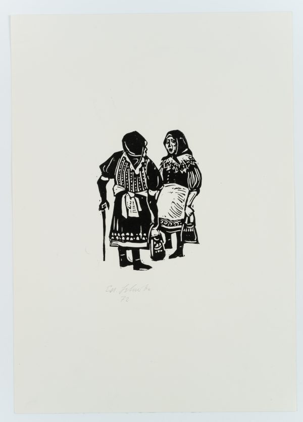 Eduard Schreiber (20th century), Meeting of two market women in traditional costume, 1972, Woodcut