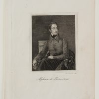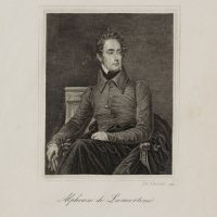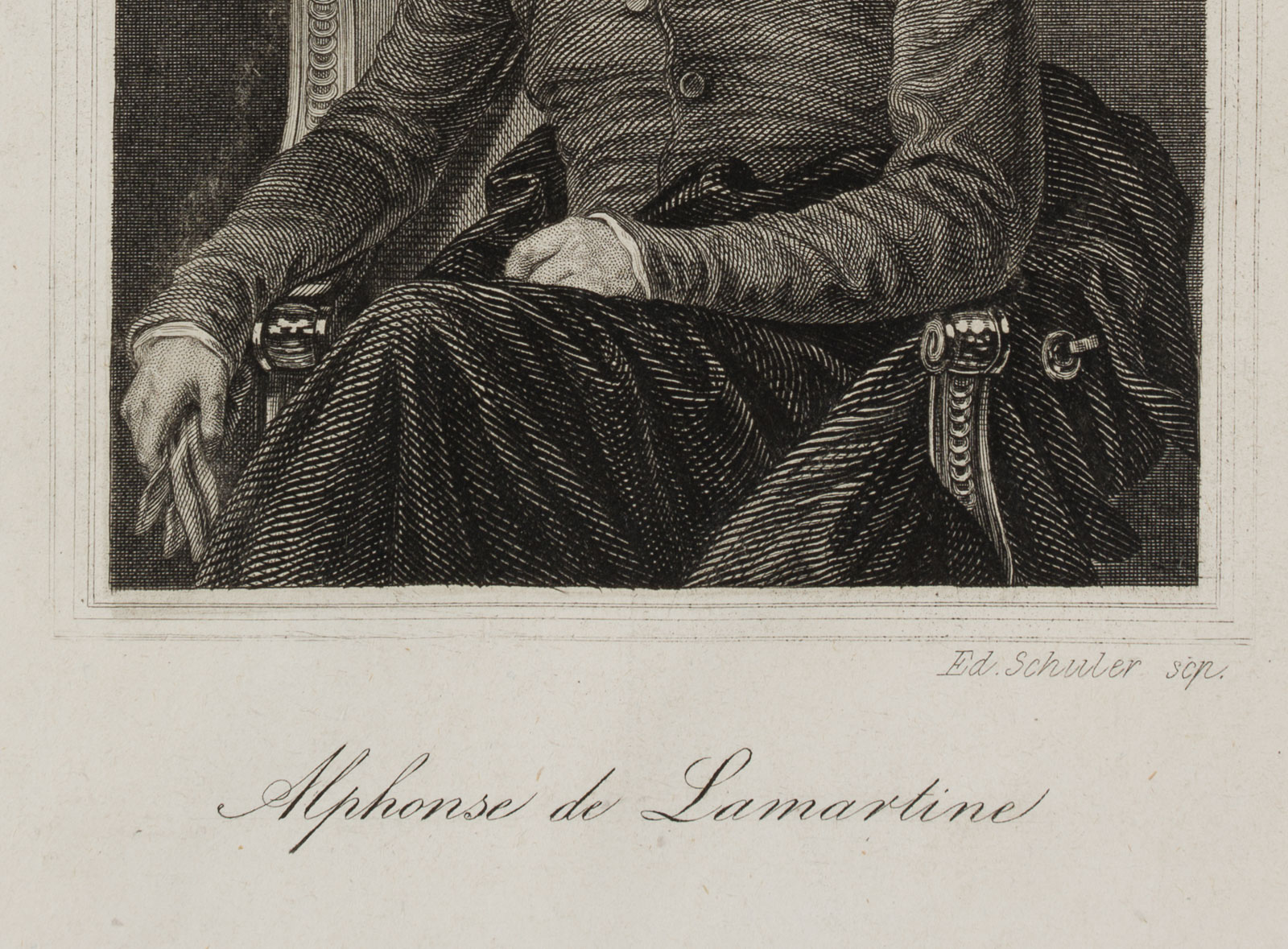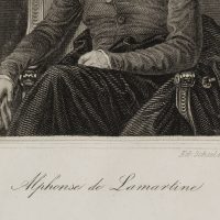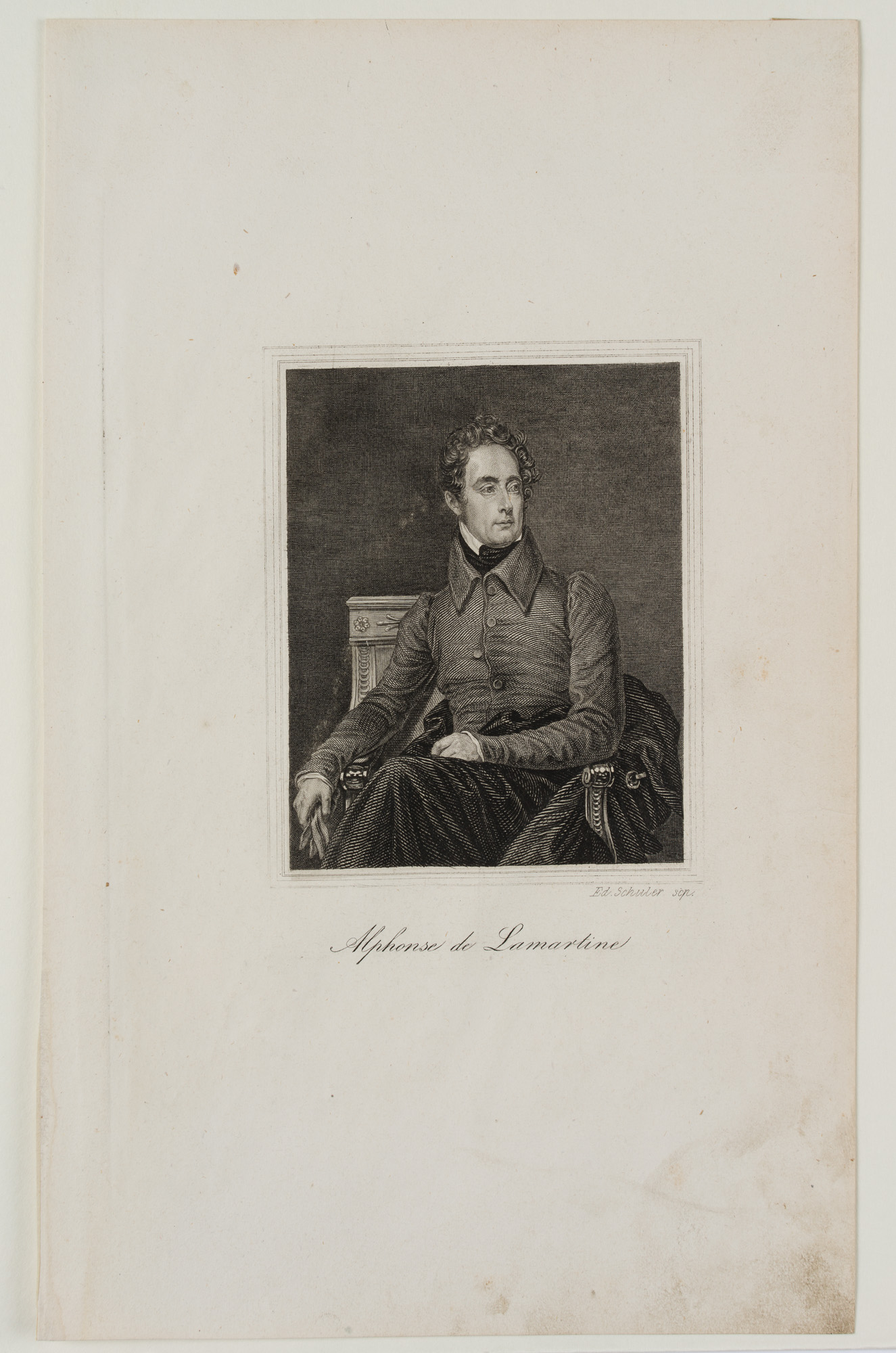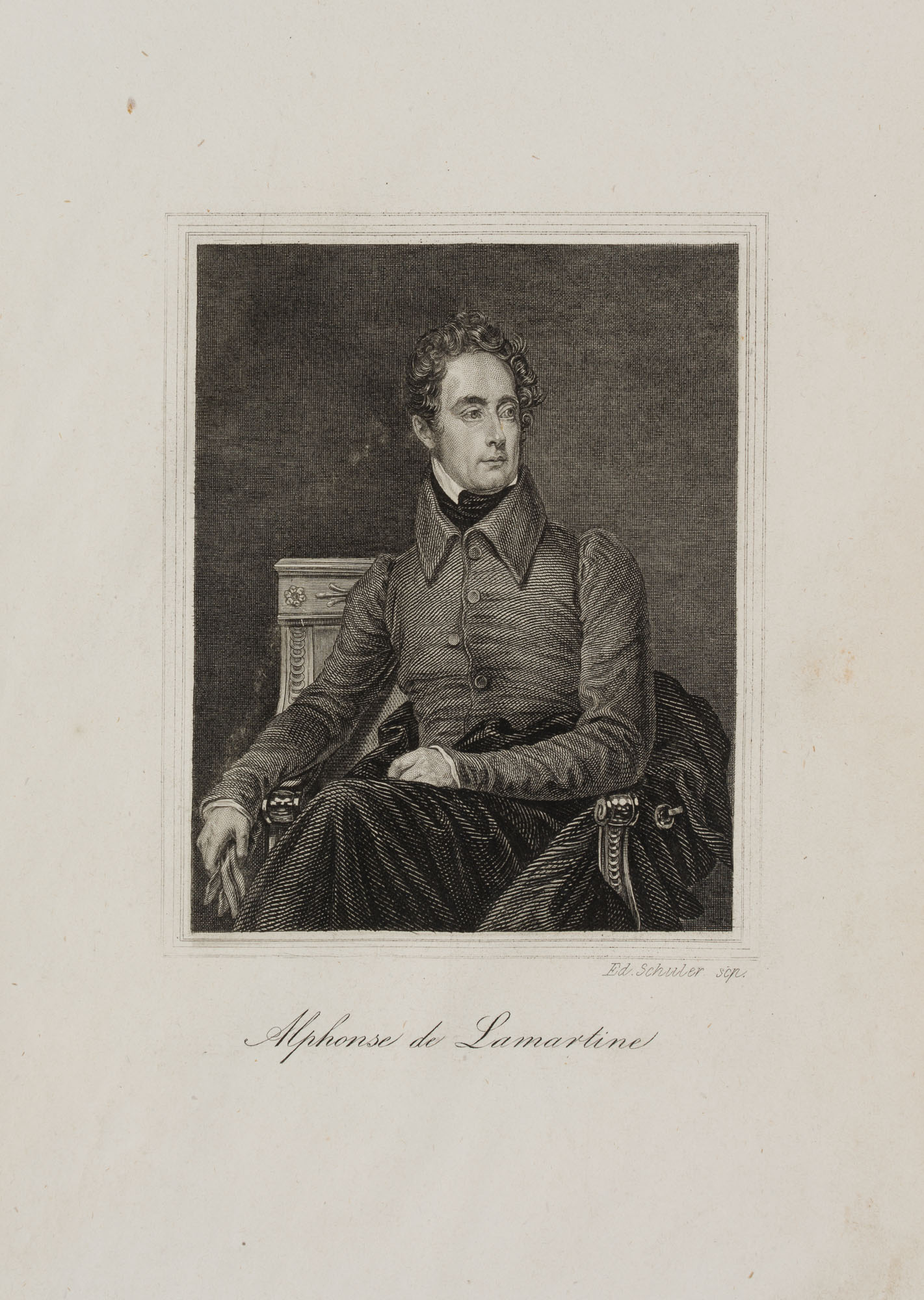 - Description: Engraving by Edouard Schuler, signed on the right below the image: “Ed. Schuler scp.”, inscribed in the centre below “Alphonse de Lamartine”. Very fine portrait of the poet. The young Lamartine is sitting on a chair with his legs loosely crossed. He has placed his right arm on the richly decorated armrest. As if he had just entered, his dark coat lies carelessly underneath him on the chair, his gloves he holds in his hand. The dark jacket with a large collar is buttoned carelessly – the middle button has been forgotten. Lamartine looks seriously over his shoulder to the side. Alphonse de Lamartine ( Mâcon 1790 – Paris 1869) was a French politician and writer of romance novels and poetry. Edouard Schuler ( Strasbourg 1805 – Lichtenthal 1882) was a steel engraver, copper engraver and lithographer.