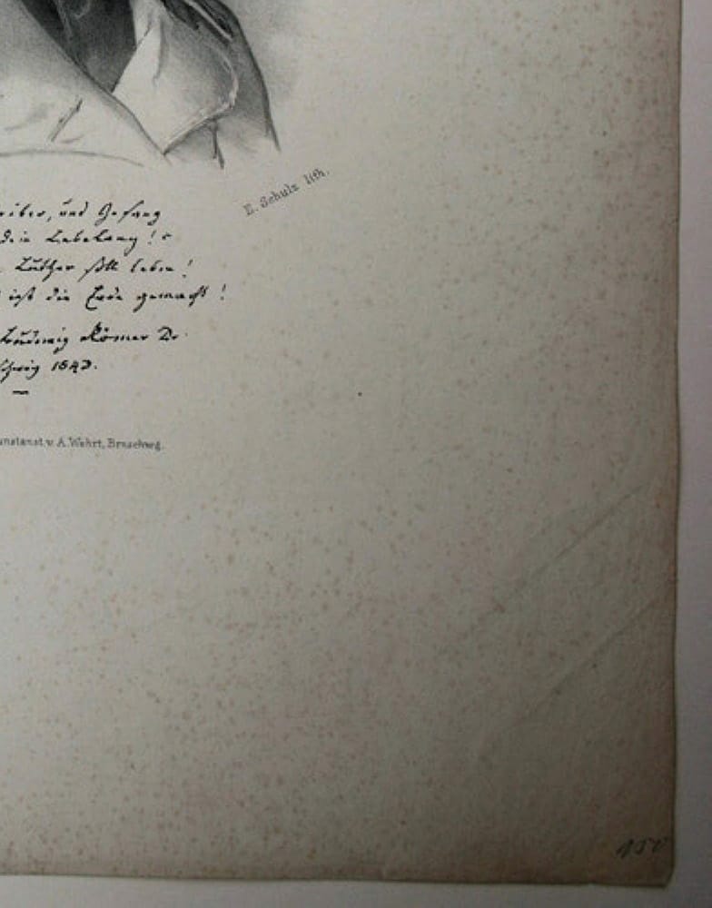 - Beschreibung: Lithographie von Emil Schulz nach A. Teichs, bezeichnet: “A. Teichs del. E. Schulz lith.”. Sehr schönes Bustbild des Jacob Ludwig Römers, arunter faksimiliert folgende Worte: “Wein, Weiber, und Gesang Hab`lieb Dein Lebenlang! Herr Martin Luther soll leben! Zur Freud` ist die Erde gemacht! Jacob Ludwig Römer Dr. Braunschweig 1843”. Jacob Ludwig Römer (Eimbeck 1770 – 1855) war Lehrer am Katharineum. Ab 1814 war er Kabinettsrat des Herzogs Friedrich Wilhelm, später Konsistorialrat. Er verfasste zahlreiche patriotische Gedichte und eine Schrift über Herzog Friedrich Wilhelm. Emil Schulz ( Wolfenbüttel 1822 – Braunschweig 1912) war deutscher Bildnismaler und Lithograph. Er war u. a. in Dresden, München, Düsseldorf und Braunschweig tätig.