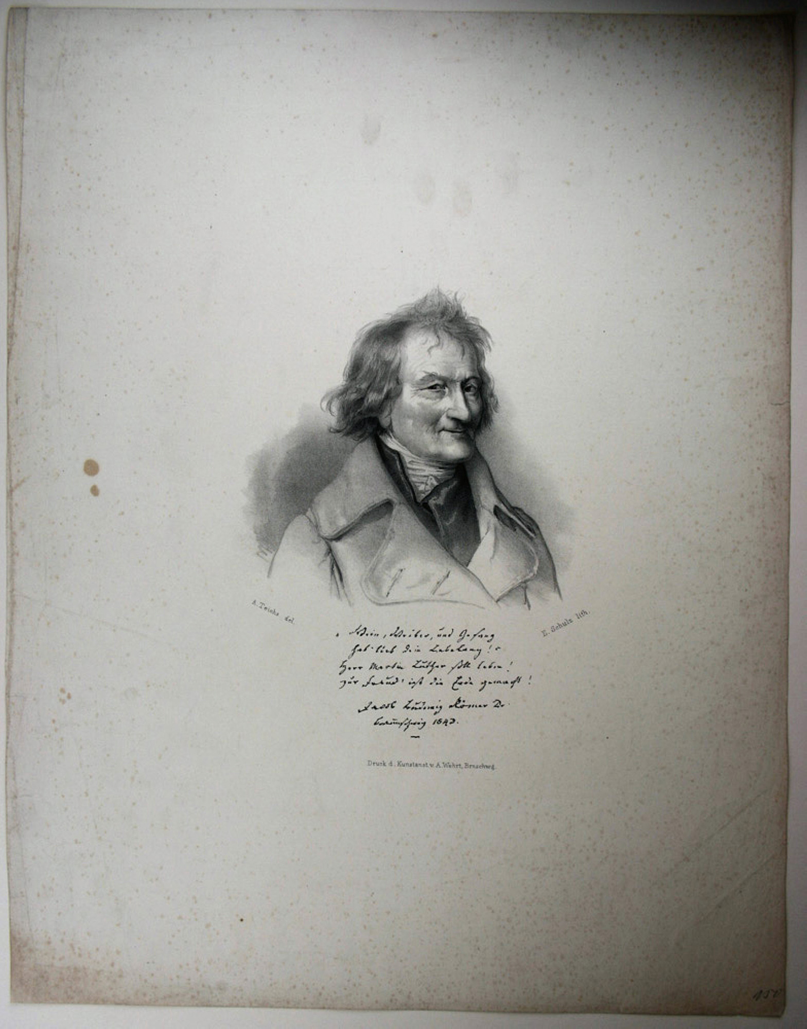 - Description: Lithograph by Emil Schulz after A. Teichs, inscribed: “A. Teichs del. E. Schulz lith.”. Very beautiful bust painting of Jacob Ludwig Römers, with the following words facsimiled below: “Wein, Weiber, und Gesang Hab`lieb Dein Lebenlang! Mr Martin Luther shall live! The earth is made for joy! Jacob Ludwig Römer Dr. Braunschweig 1843”. Jacob Ludwig Römer (Eimbeck 1770 – 1855) was a teacher at the Katharineum. From 1814 he was a cabinet councillor to Duke Friedrich Wilhelm, later a consistory councillor. He wrote numerous patriotic poems and a book about Duke Friedrich Wilhelm. Emil Schulz ( Wolfenbüttel 1822 – Brunswick 1912) was a German portrait painter and lithographer. He worked in Dresden, Munich, Düsseldorf and Brunswick, among other places.