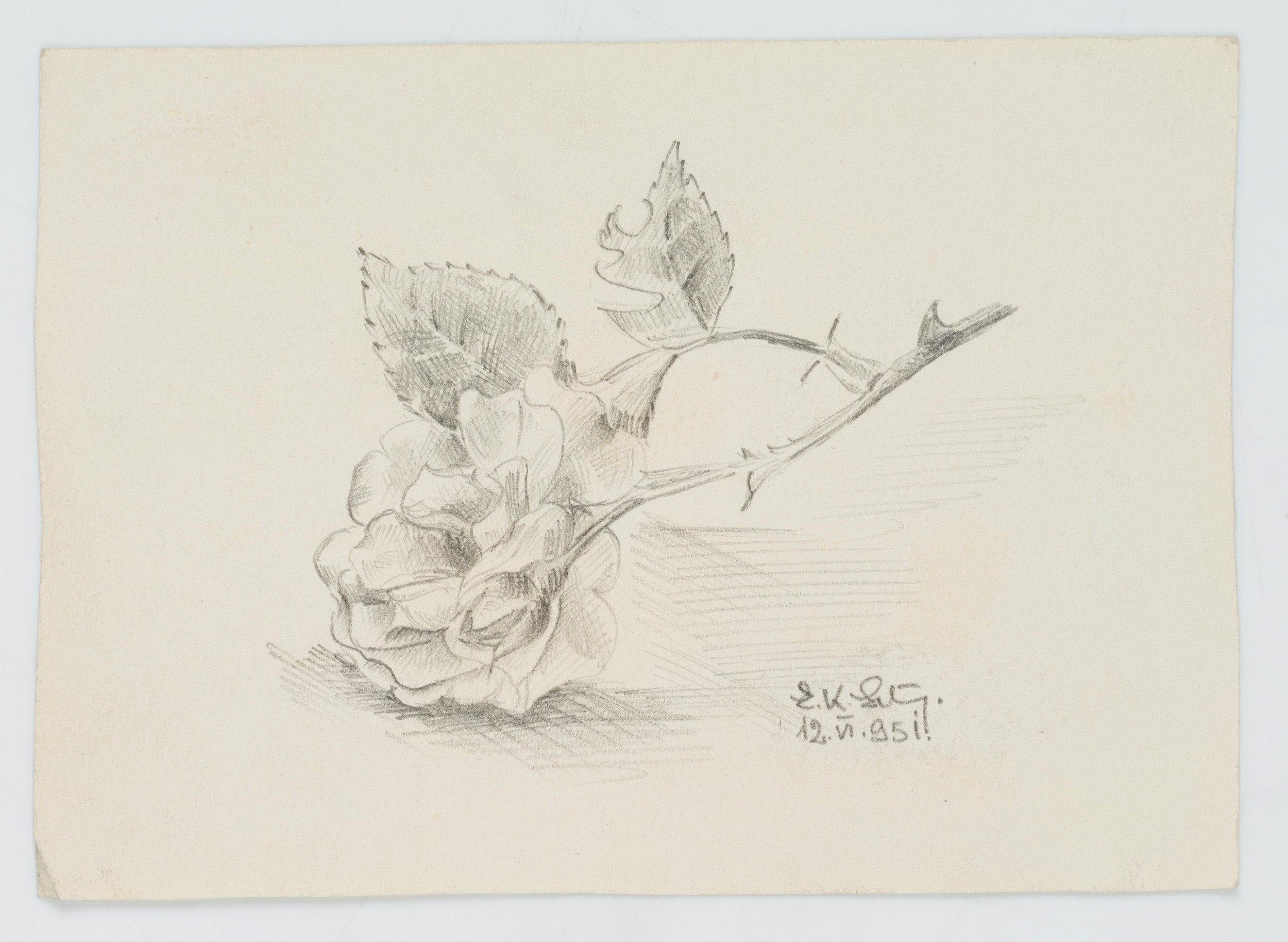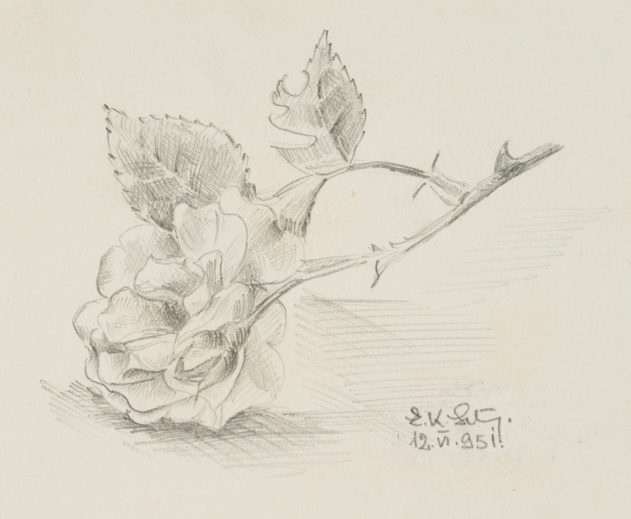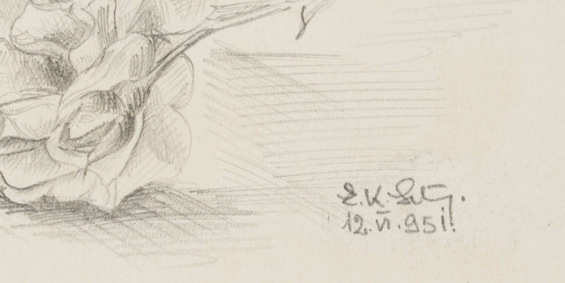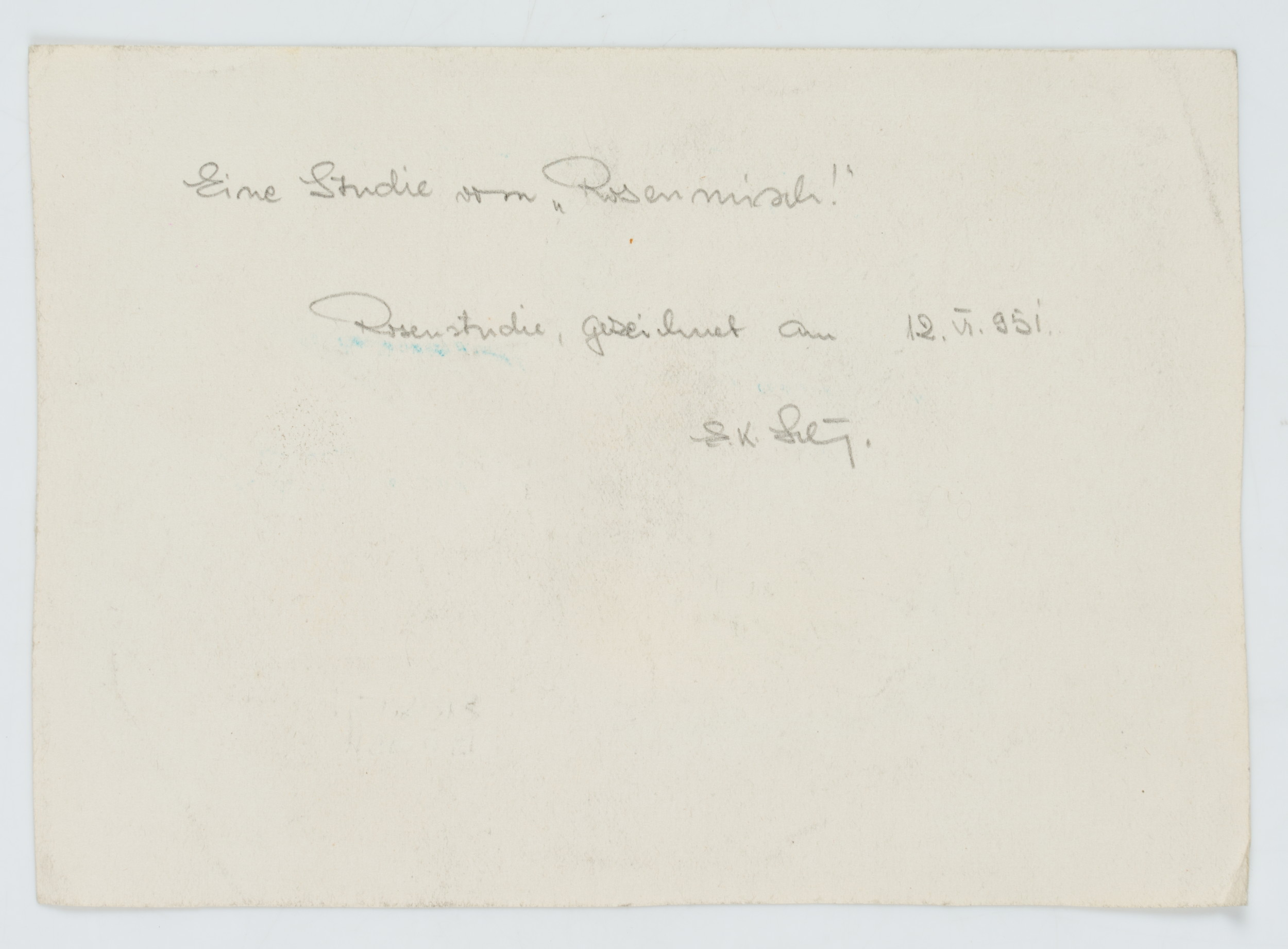 - Bezeichnung: Unten rechts signiert: “E.K.Schunn[?]”. Unten rechts datiert: “12.VI. 95”. Verso eigenhändig bezeichnet: “Eine Studie vom ‘Rosenmichl'[?] / Rosenstudie, gezeichnet am 12. VI. 95i / E.K. Schunn”.