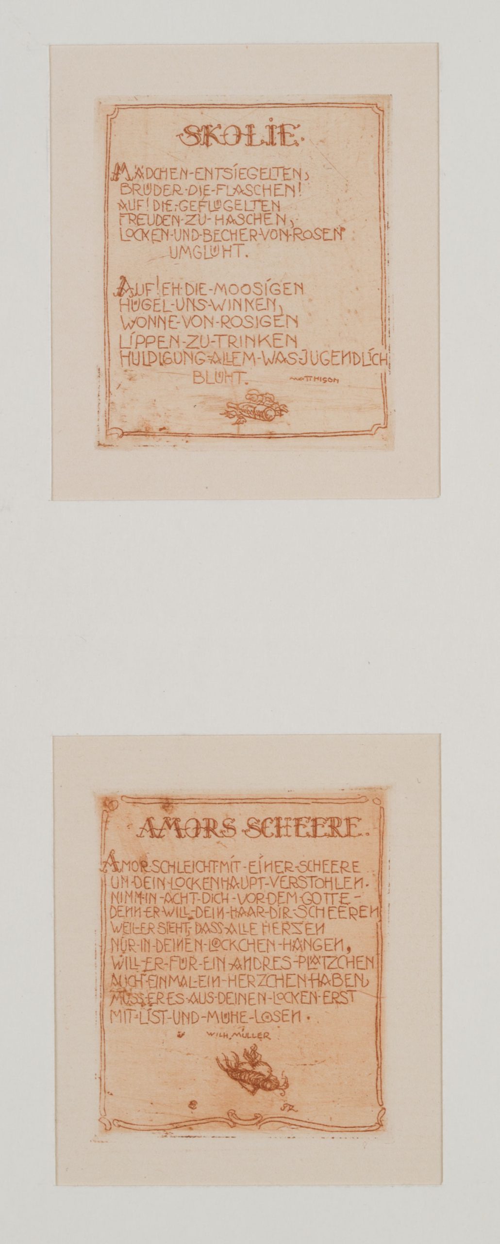 • Description: Monogrammed below the song “Amors Scheere” “E.TH.”. Four small prints from “Neun anakreontische Lieder. 20 etchings by Erwin THEERMANN, 1925”. Please also note our further offer on this series of prints. Erwin THEERMANN, born in 1905, went to Munich as a young man to devote himself to art history and the study of the arts. Already as a teenager he dedicated himself to graphic art, which he continued during his years in Munich. Preferring small formats in particular, THEERMANN succeeds in telling stories in comparably small pictorial spaces.
