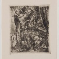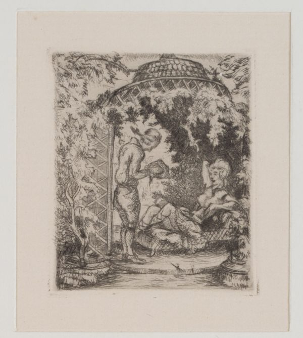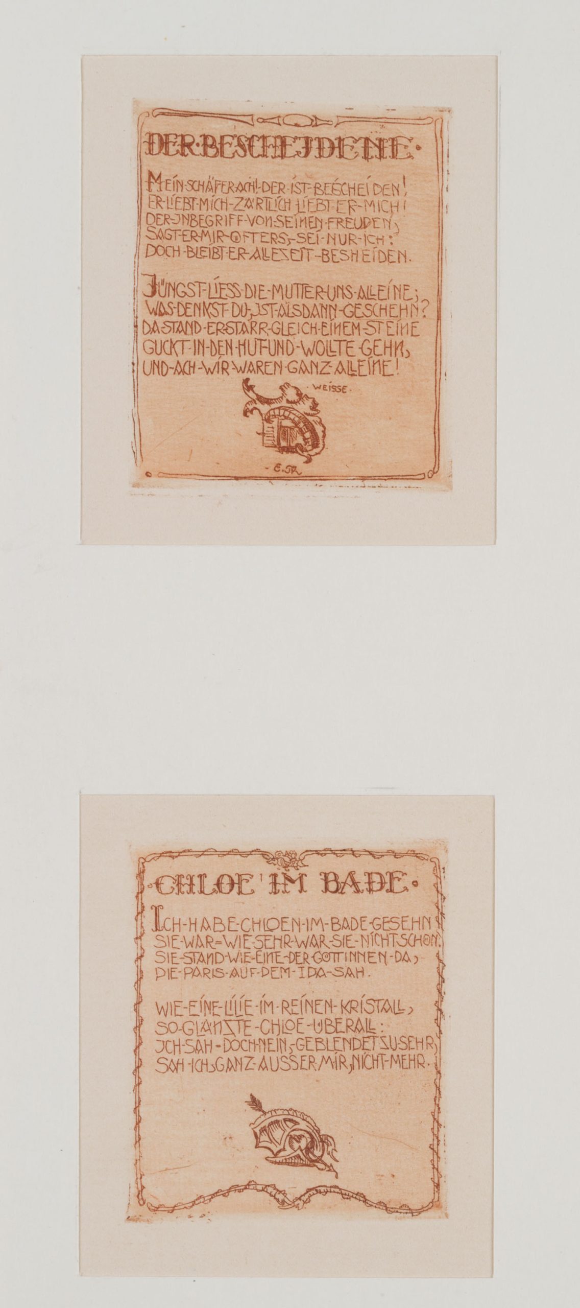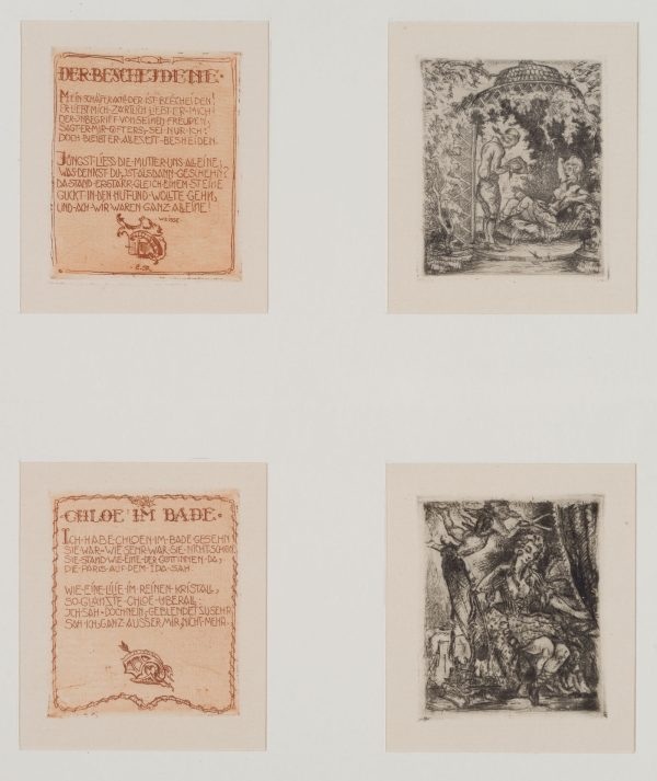 - Description: Monogrammed below the song “Der Bescheidene” “E.TH.”. Four small prints from “Neun anakreontische Lieder. 20 etchings by Erwin THEERMANN, 1925”. Please also note our further offer on this series of prints. Erwin THEERMANN, born in 1905, went to Munich as a young man to devote himself to art history and the study of the arts. Already as a teenager he dedicated himself to graphic art, which he continued during his years in Munich. Preferring small formats in particular, THEERMANN succeeds in telling stories in comparably small pictorial spaces.