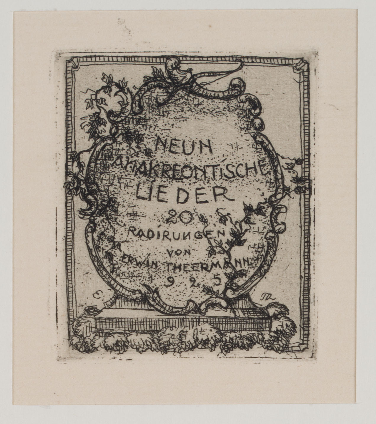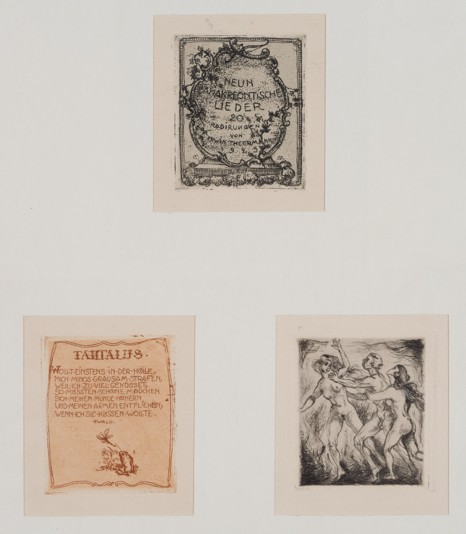 - Description: Monogrammed on the title page “E.TH.”. Three small prints from “Neun anakreontische Lieder. 20 etchings by Erwin THEERMANN, 1925” with title page. Please also note our further offer on this series of prints. Erwin THEERMANN, born in 1905, went to Munich as a young man to devote himself to art history and the study of the arts. Already as a teenager he dedicated himself to graphic art, which he continued during his years in Munich. Preferring small formats in particular, THEERMANN succeeds in telling stories in comparably small pictorial spaces.