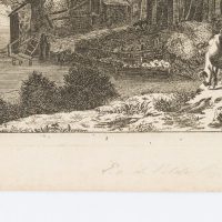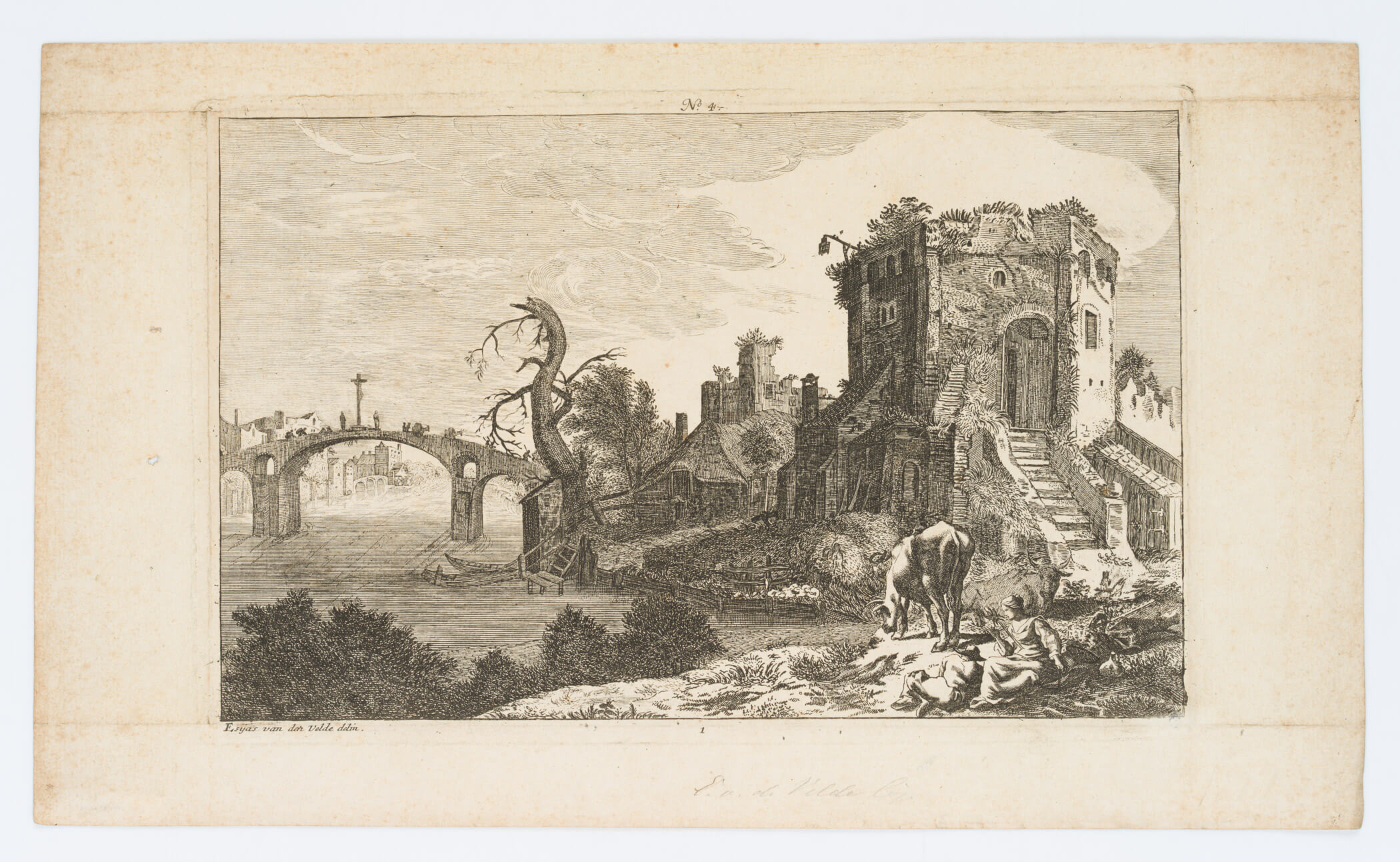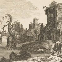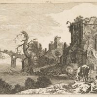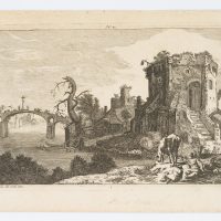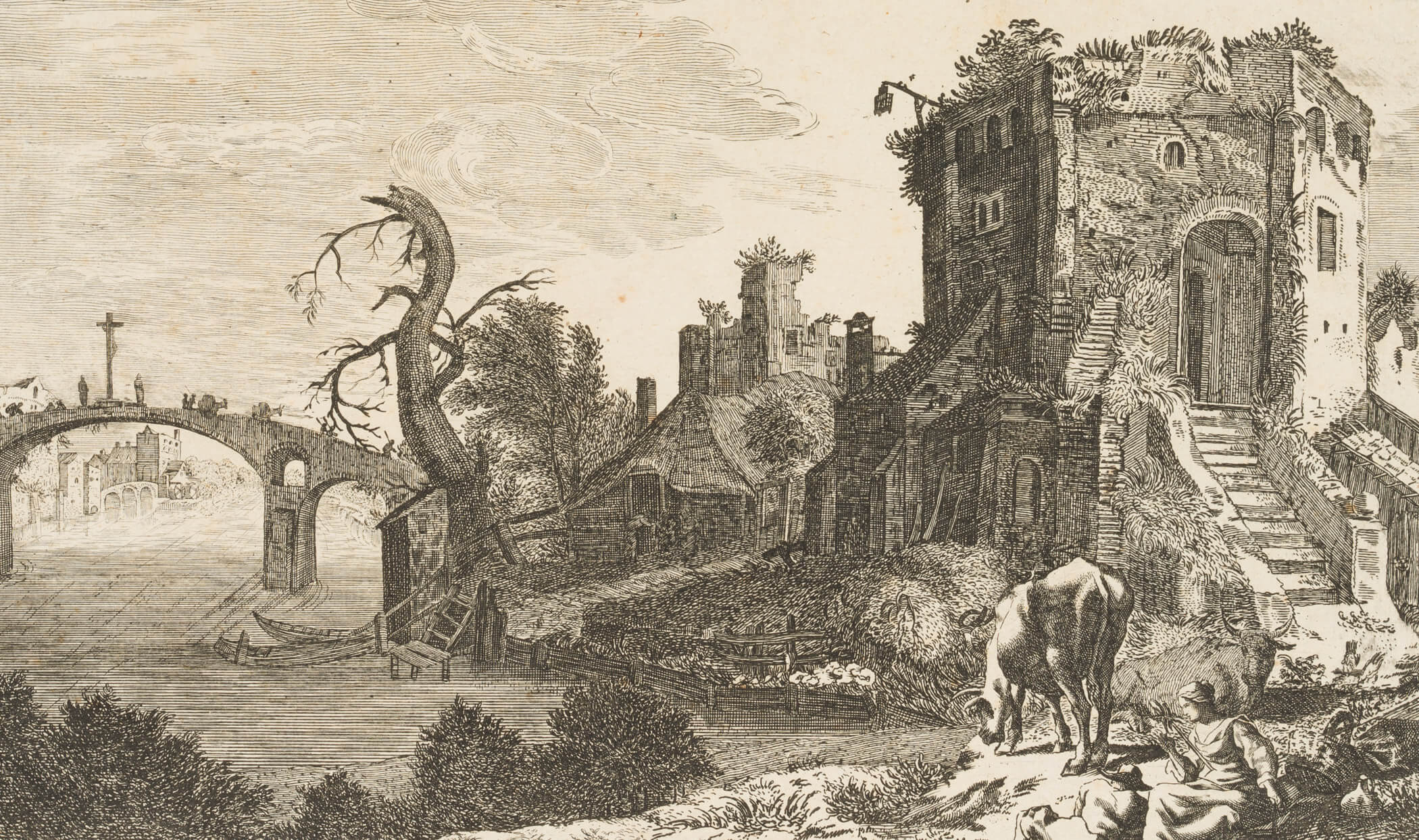 - Description: Engraving of an idyllic landscape of ruins with a bridge and a grazing cow.