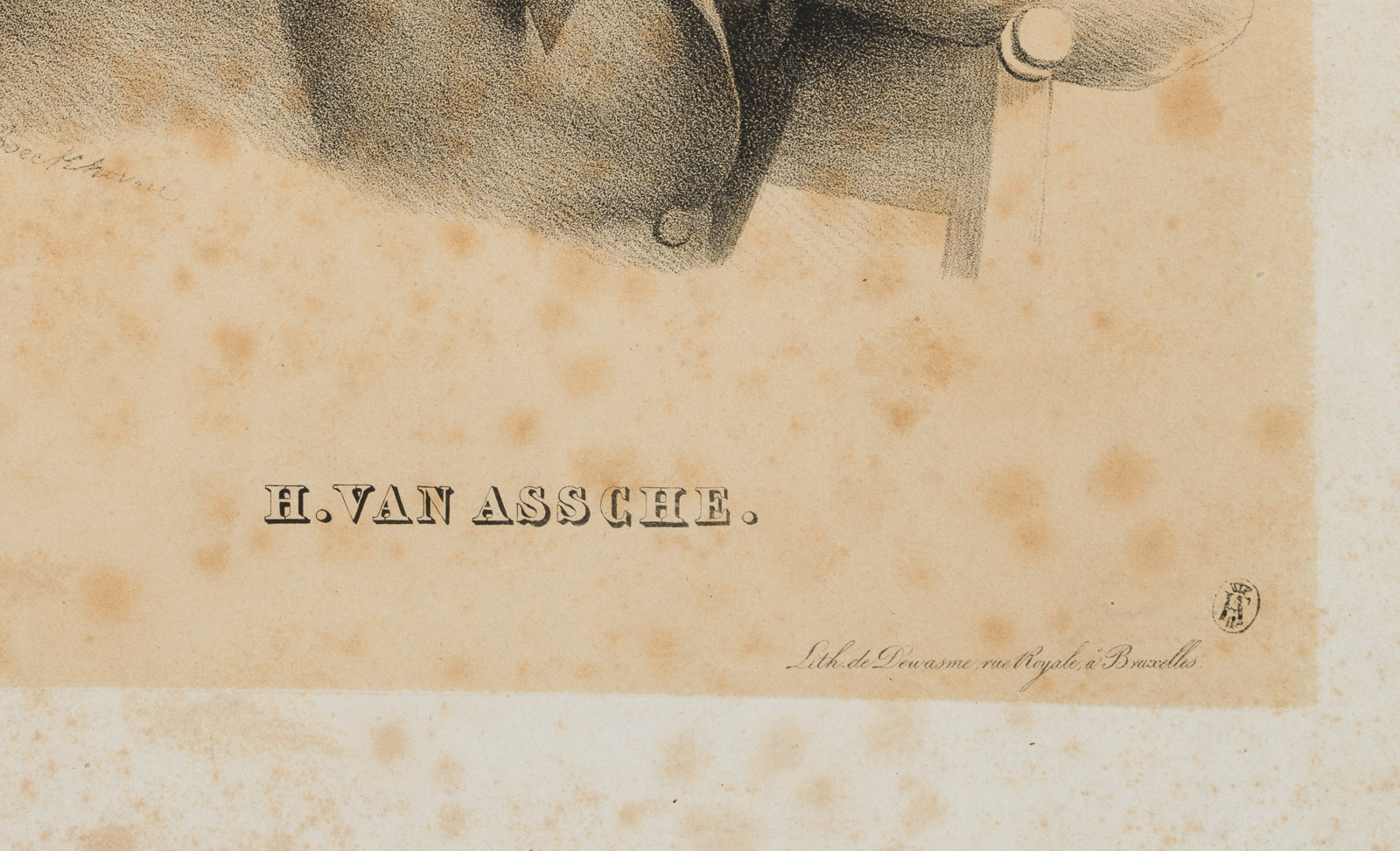 • Bezeichnung: Links unter dem Dargestellten signiert und datiert, darunter mit dem Namen des Dargestellten beschriftet. Links unten mit Sammlerstempel, darin die Initialen “IAT[?] mit Krone, daneben: “Lith de Dewasme, rue Royale a Bruxelles”.