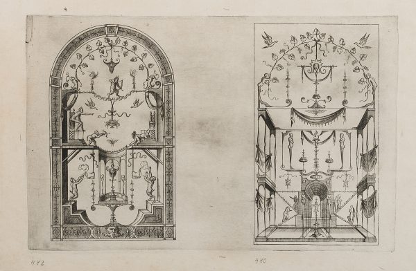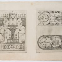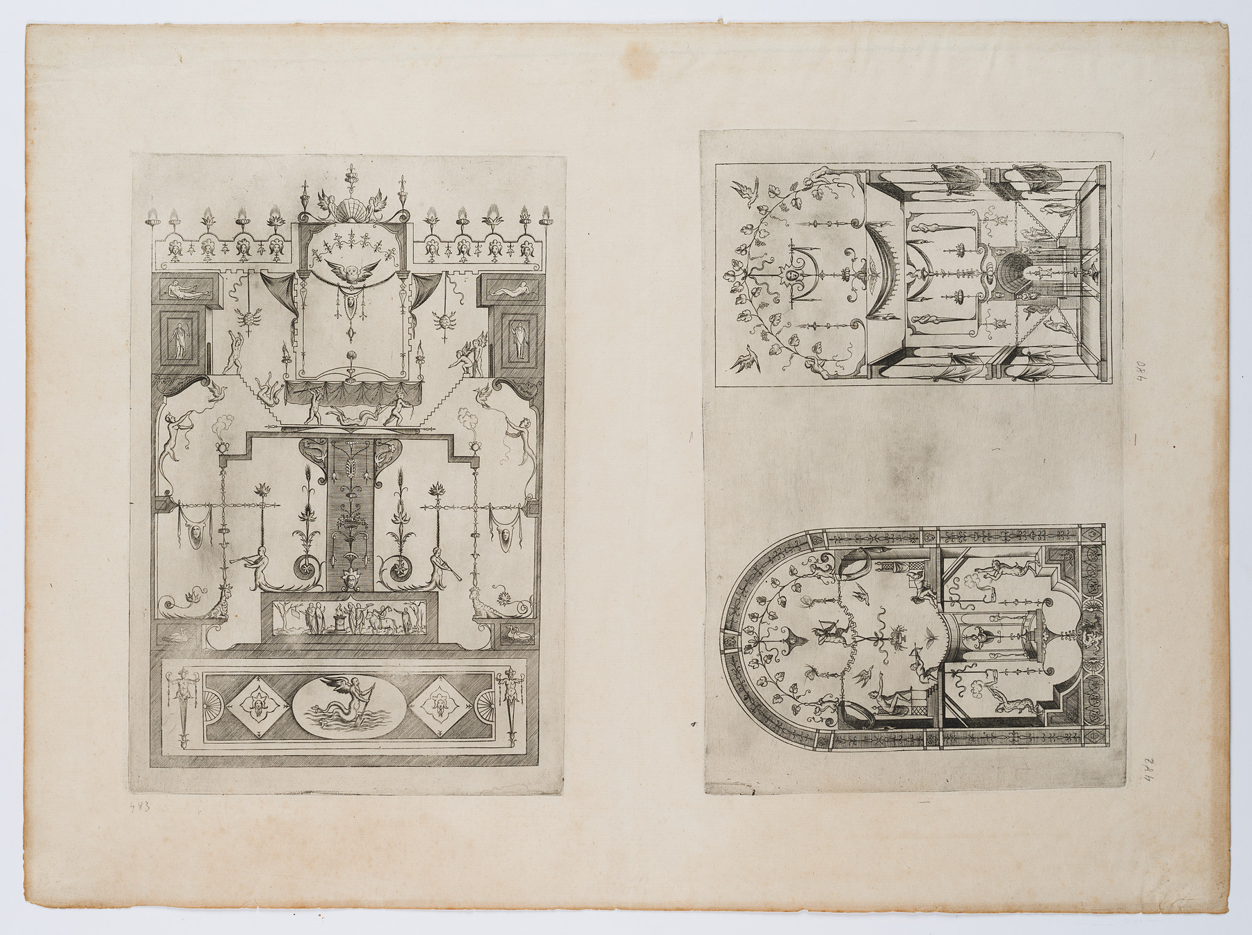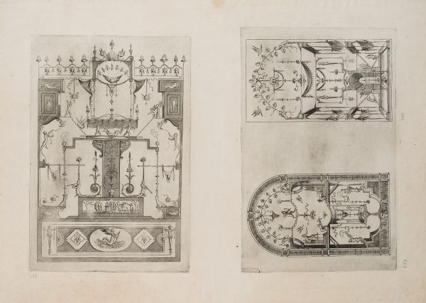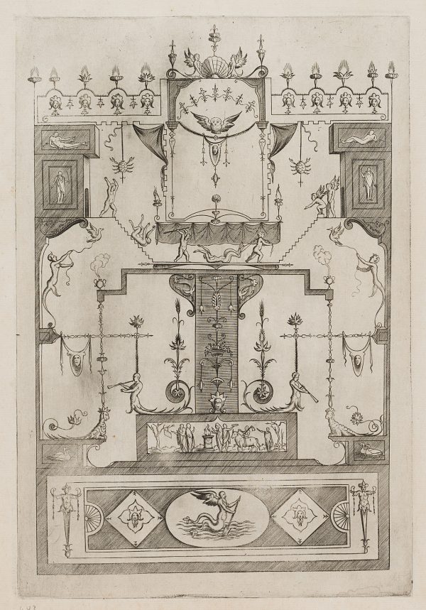 - Beschreibung: Feiner Entwurf einer Wanddekoration mit Grotesken und kleinen Figuren im architektonischen Aufbau. Aus der Folge “Leviores et (ut videtur) extemporaneae picturae quas grotteschas vulgo vocant etc.”, seitenverkehrte Stichen nach Enea Vicos Groteskenfolge, herausgegeben von Antonio Lafreri. | Wasserzeichen: Laufende Figur im Kreis