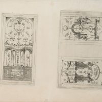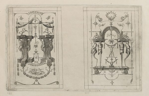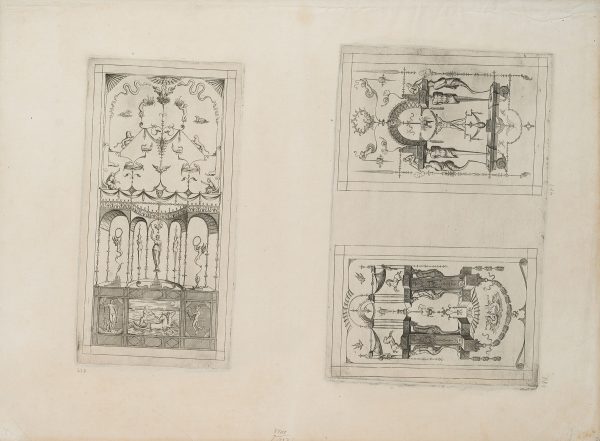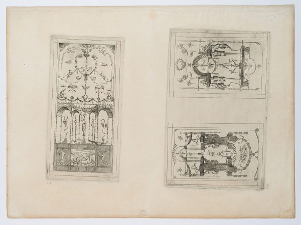 - Beschreibung: Feiner Entwurf einer Wanddekoration mit Grotesken und kleinen Figuren im architektonischen Aufbau. Aus der Folge “Leviores et (ut videtur) extemporaneae picturae quas grotteschas vulgo vocant etc.”, seitenverkehrte Stichen nach Enea Vicos Groteskenfolge, herausgegeben von Antonio Lafreri. | Wasserzeichen: Laufende Figur im Kreis
