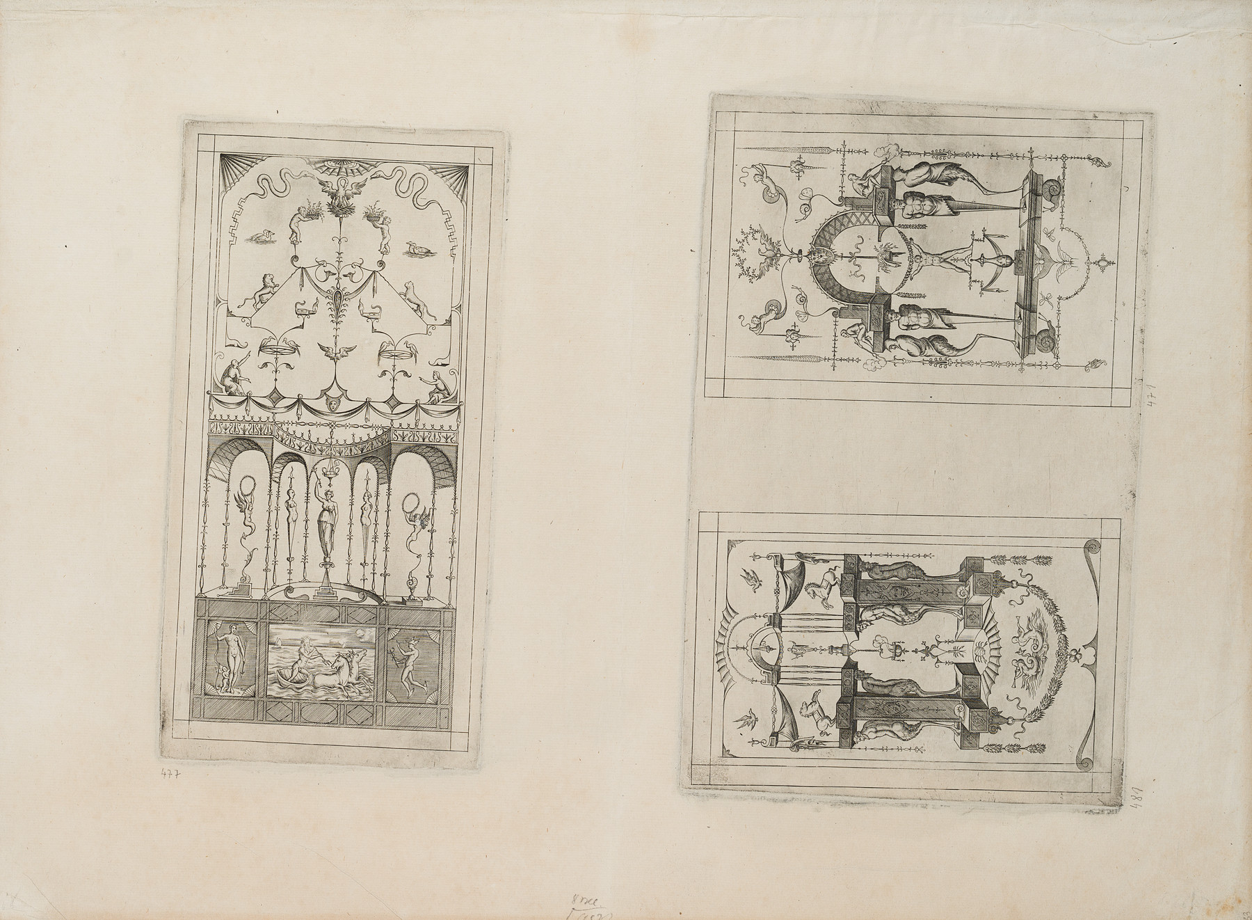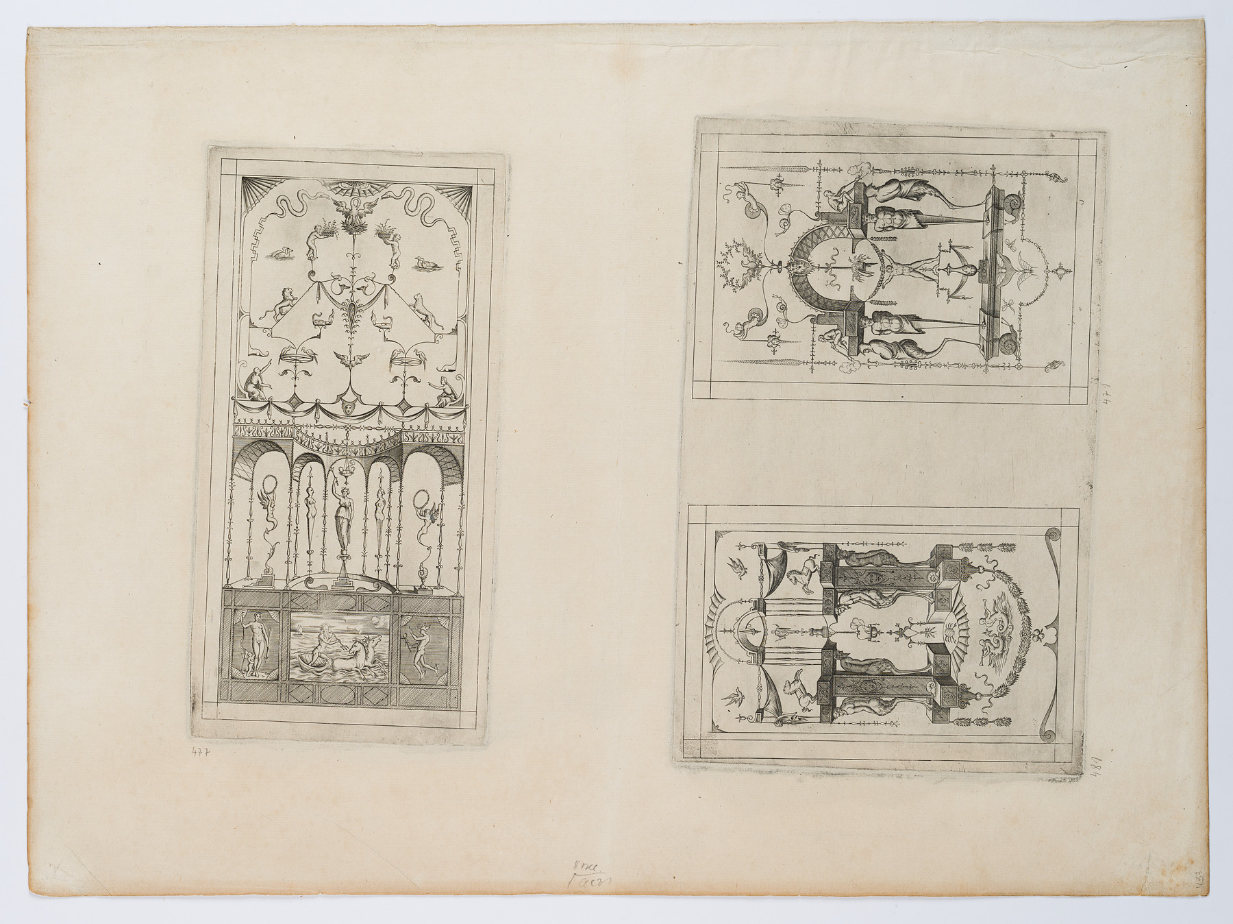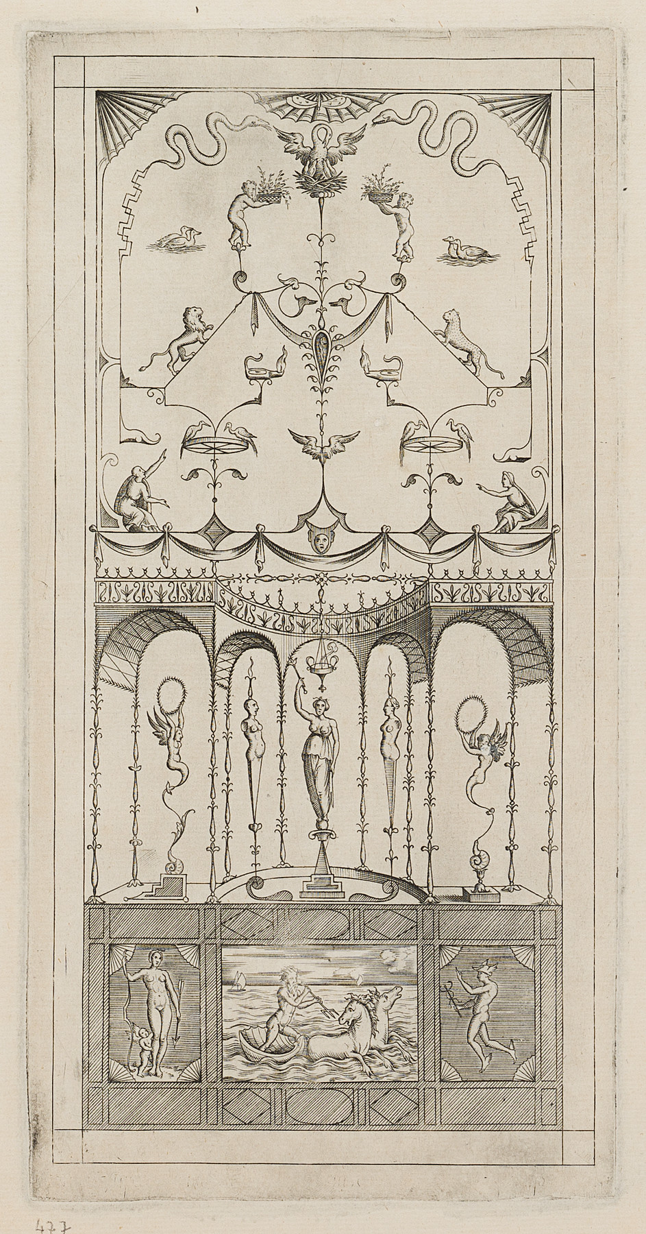 Enea Vico (1523 Parma – 1567 Ferrara), Grotesque wall filling with Neptune, c. 1573, Copper engraving
