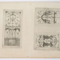 - Description: Fine design of a wall decoration with grotesques and small figures in architectural construction. From the series “Leviores et (ut videtur) extemporaneae picturae quas grotteschas vulgo vocant etc.”, side-inverted engravings after Enea Vico’s series of grotesques, edited by Antonio Lafreri. | Watermark: Laufende Figur im Kreis