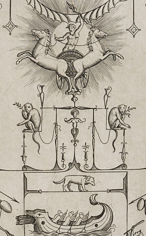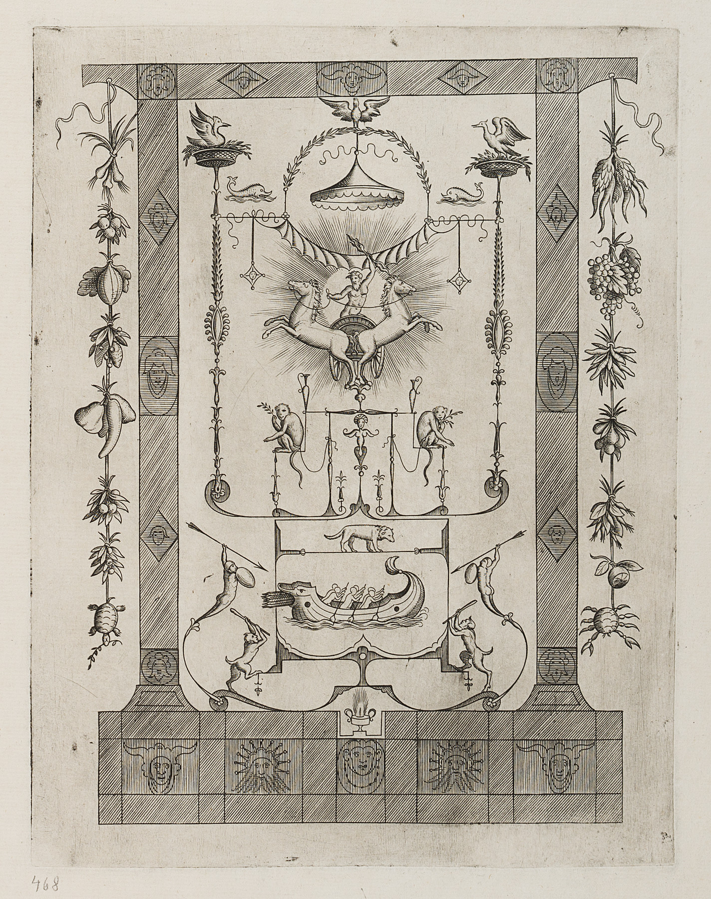 Enea Vico (1523 Parma – 1567 Ferrara), Grotesque wall filling with Zeus in a chariot, c. 1573, Copper engraving