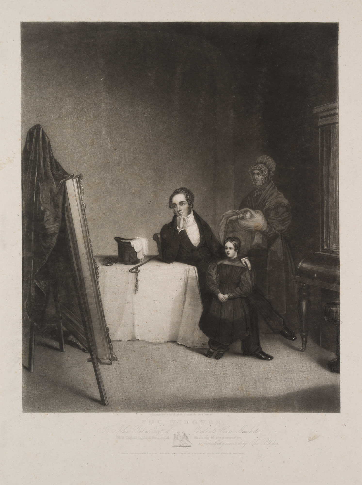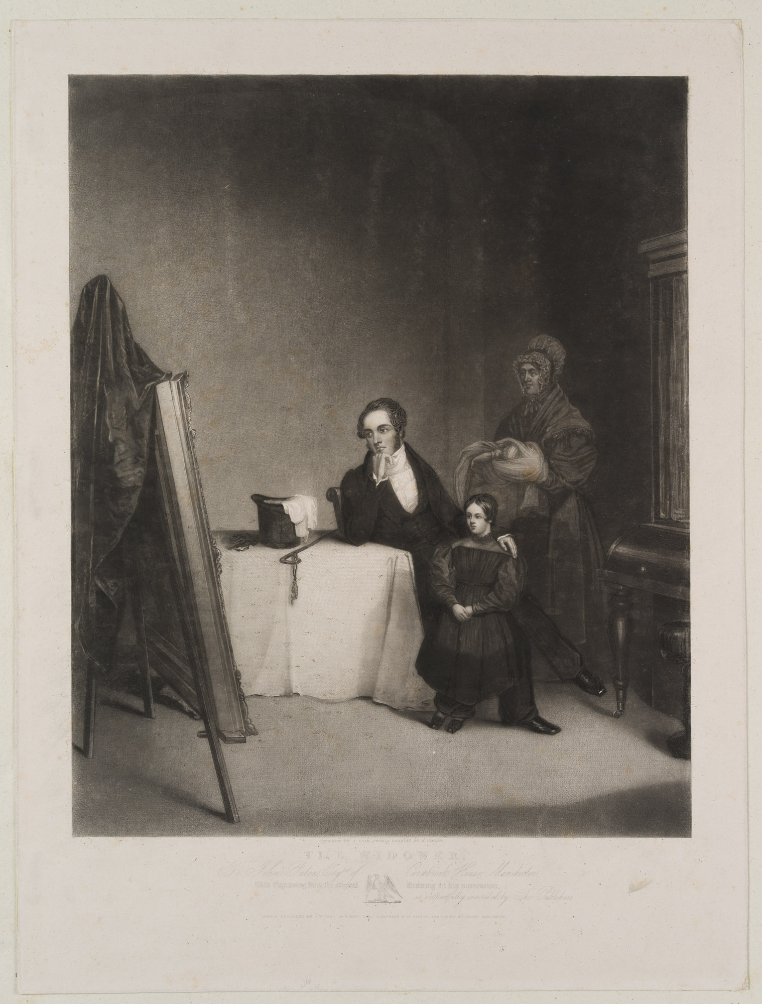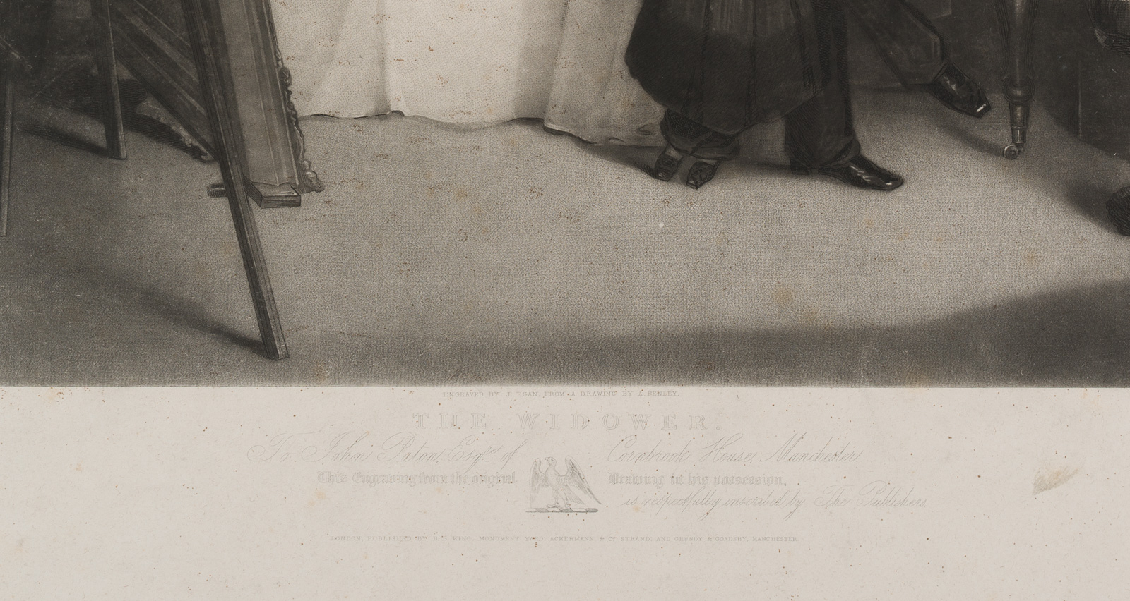 - Description: Unter der Darstellung signiert und bezeichnet “Engraved by J. Egan From a drawing by A. Penley / The Widower / To John Paton Cornbrook House Manchester / This Engraving from the original drawing in his possession is respectfully inscribed by The Publishers / London published by B.B. King Monument Yard, Ackermann & Co Strand; and Grundy & Goadsby, Manchester”.
