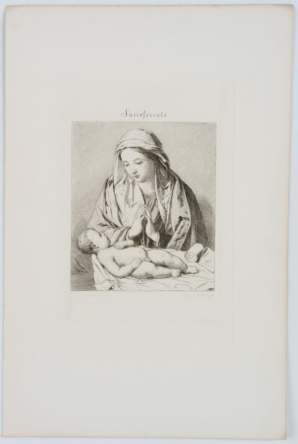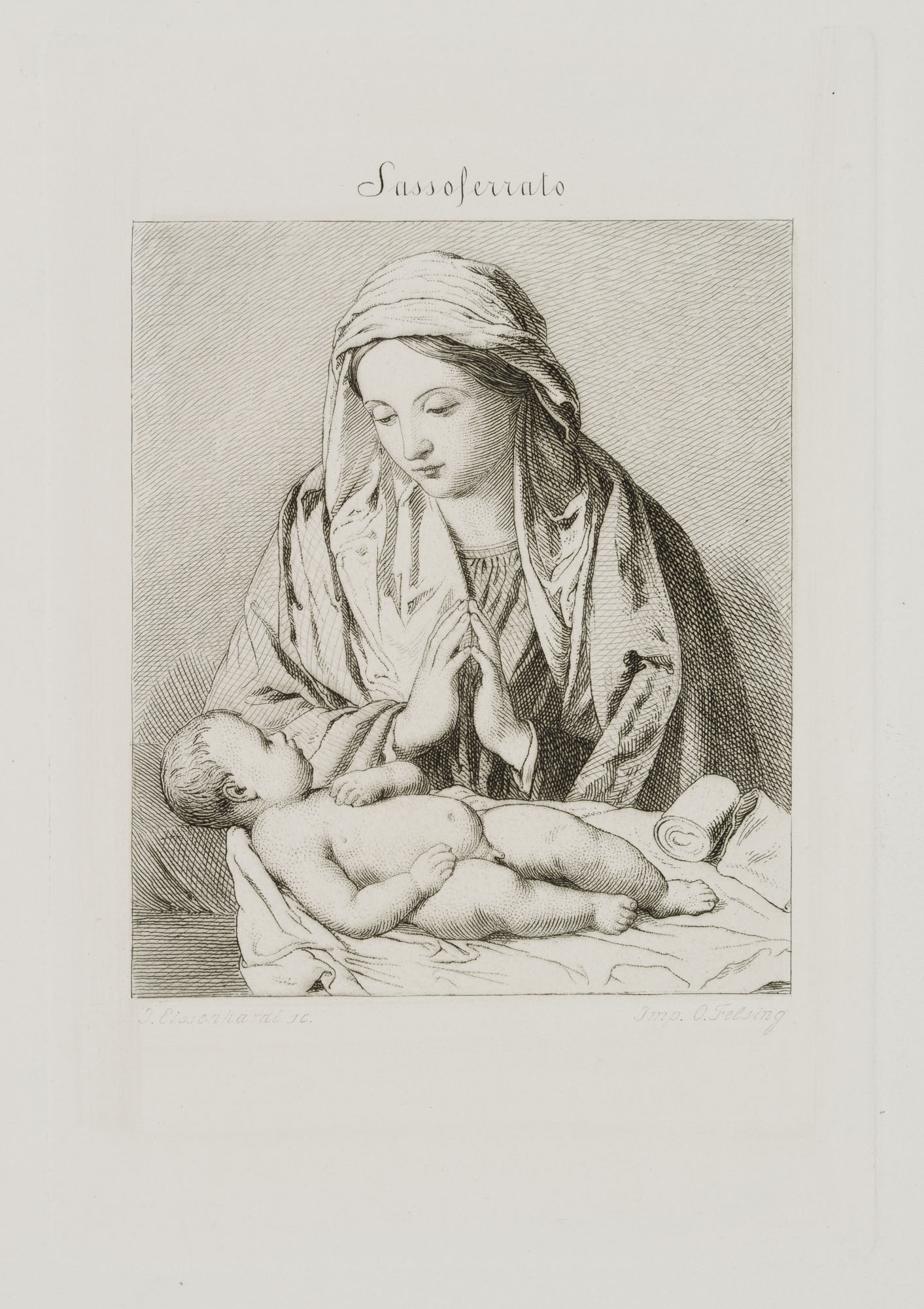 - Description: Printed by Otto FELSING (1831 Darmstadt-1878 Berlin), after the painting “Maria, adoring the Child” by the Baroque painter Sassoferrato (Giovanni Battista Salvi), created around 1640-1660? Signed below the depiction in the printing plate “J. Eissenhardt sc. / Imp. O. Felsing”, inscribed at the top “Sassoferrato”.