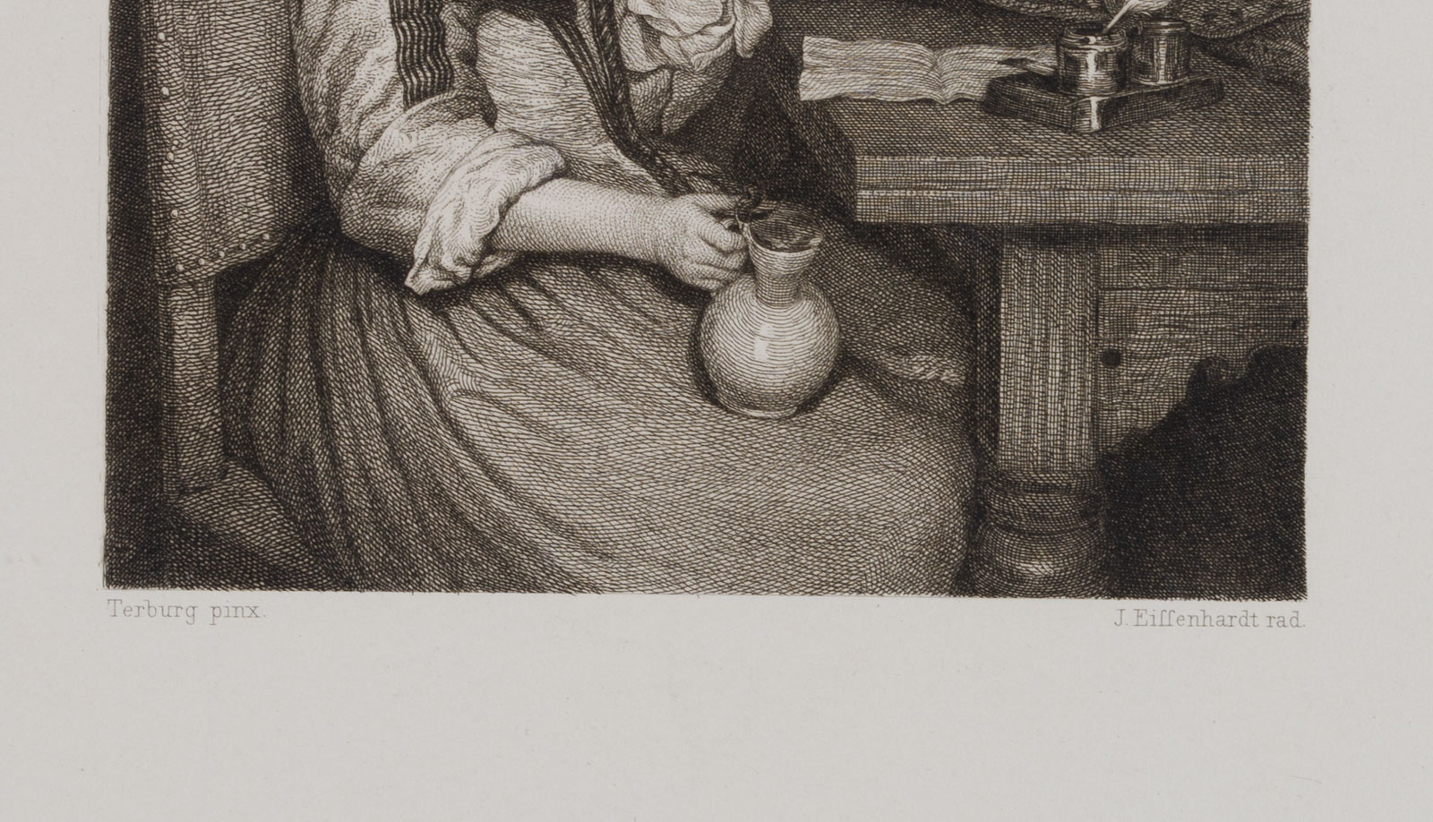 - Bezeichnung: Unten rechts im Druck signiert: “J. Eissenhardt rad.”. Unten links im Druck bezeichnet: “Terburg pinx.”.