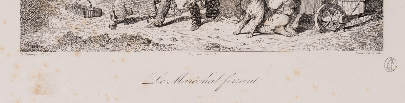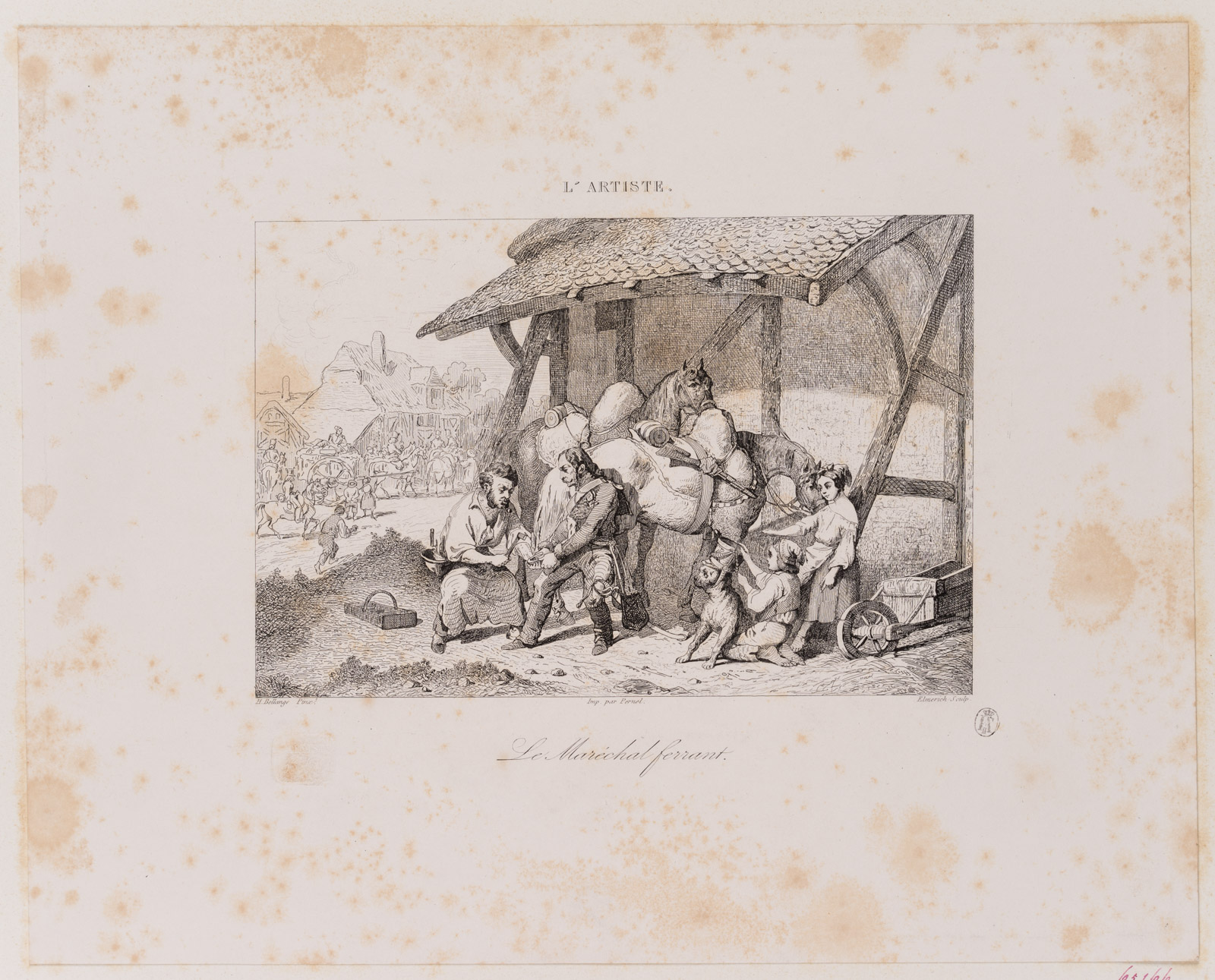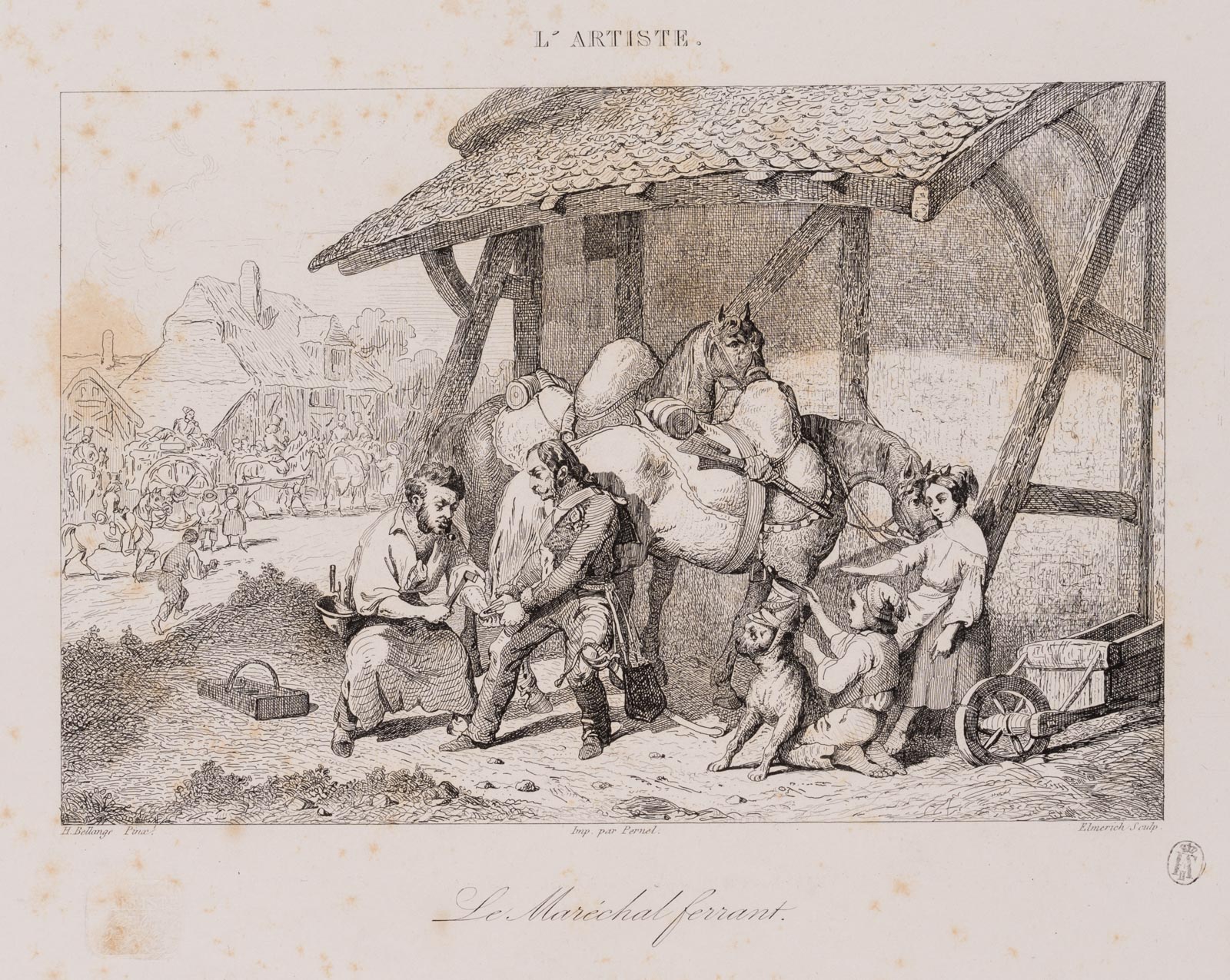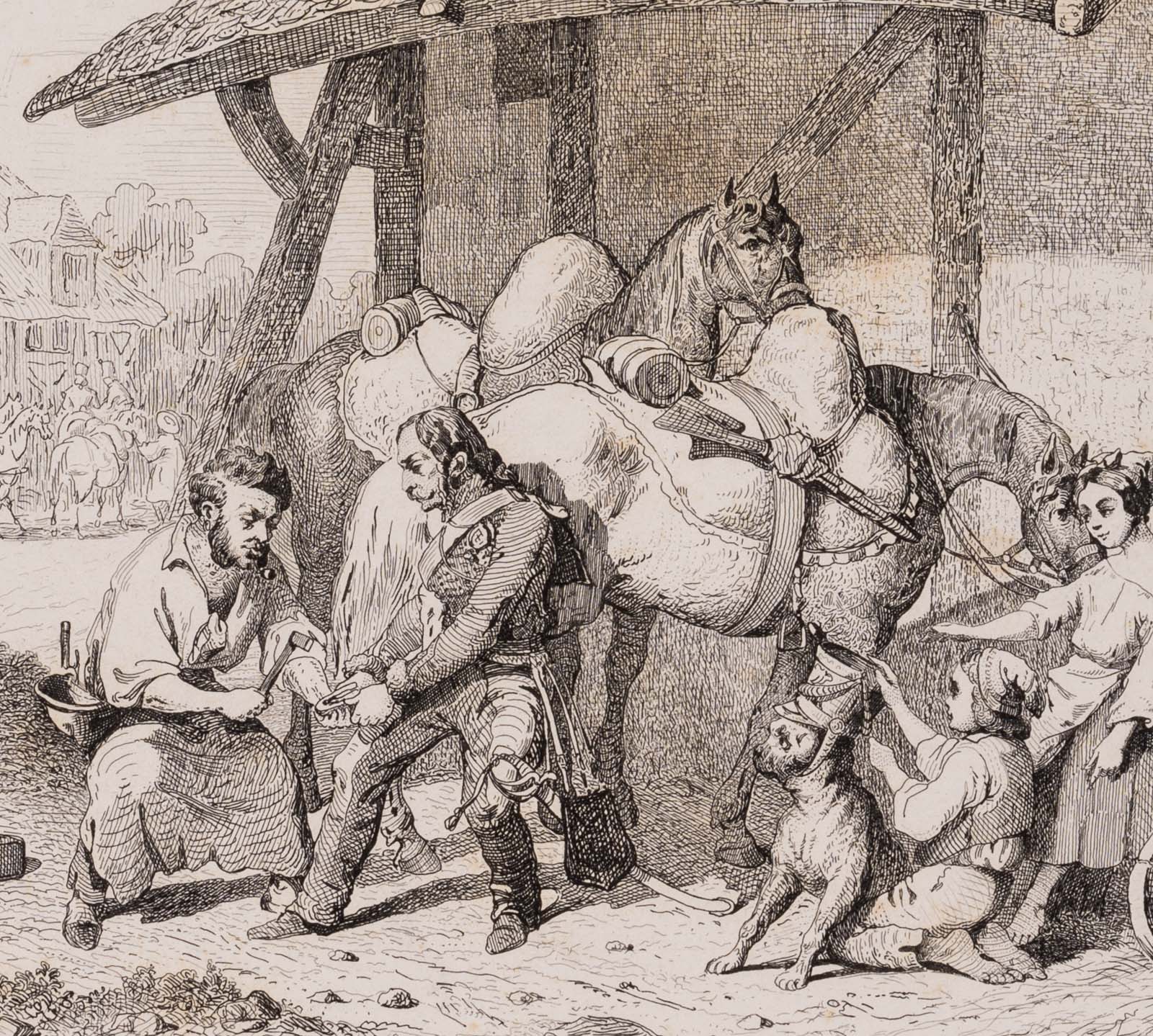 Charles Edouard Elmerich (1813 Besancon – 1889 Paris) after Hippolyte Bellangé (1800 Paris – 1866 ibid.), “Le Maréchal-ferrant”, Meldereiter beim Hufschmied, L’Artiste, 19th century, Etching