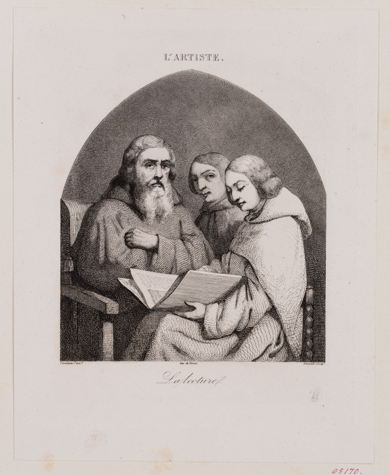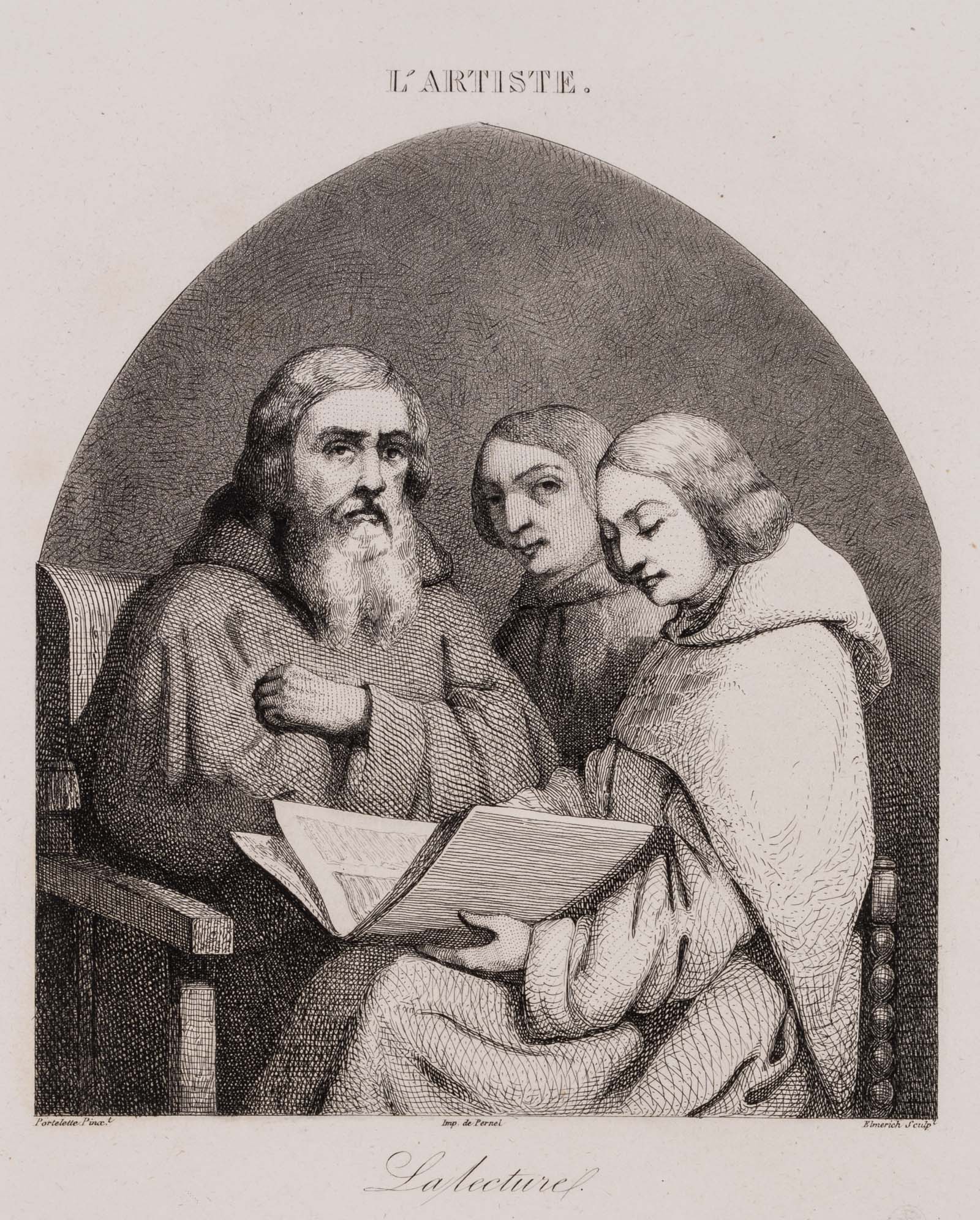 Charles Edouard Elmerich (1813 Besancon – 1889 Paris) after Hippolyte PORTELETTE (around 1800 – around 1835 ), “La lecture”, monks reading the scripture, L’Artiste, 19th century, Aquatint