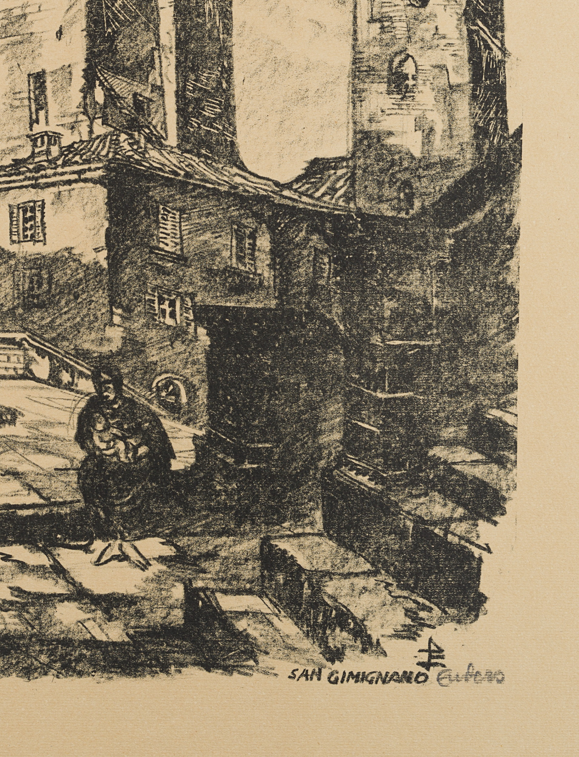 - Bezeichnung: Unten rechts signiert: “Enders”, darüber im Druck ligiert monogrammiert”. Unten rechts im Druck bezeichnet: “San Gimignano”.