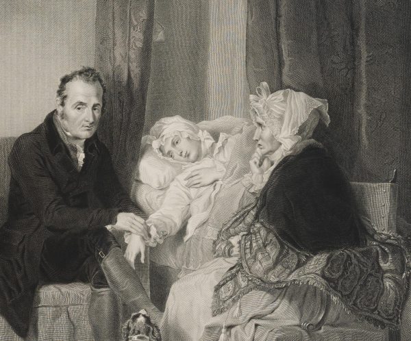 - Beschreibung: Eine bettlägerige kranke junge Frau wird von einem Arzt untersucht, begleitet von ihren ängstlichen Eltern.