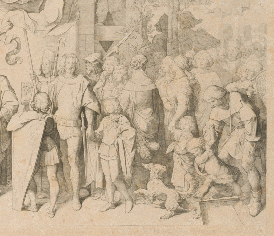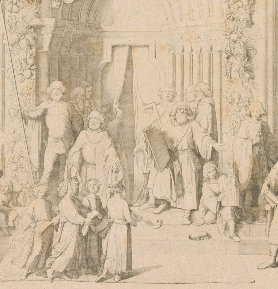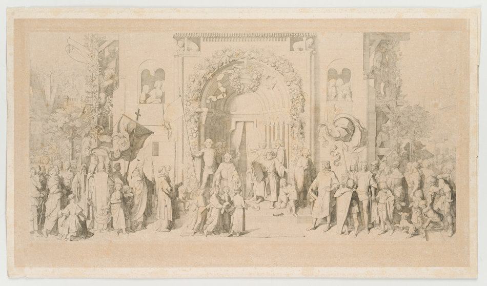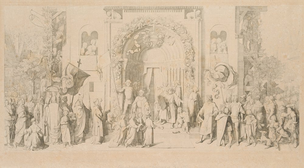 Julius Ernst (1830 Winterthur – 1861 Munich) after Moritz von Schwind (1804 Vienna – 1871 Munich), The solemn consecration of the cathedral at Freiburg im Breisgau, 1857, Steel engraving